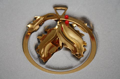 Georg Jensen, Juleuro 1988 Kristtjørn designet af Lene Munthe uddannet designer på Kunstakademiets Arkitektskole. Juleuroen er udført i messing belagt med 24 karat guld. Originalt rødt silkebånd og gaveæske medfølger. Pæn stand. Med 3 kugler, mangler 1 på bagside. Usamlet. Pris: 450 kr. Pris: Lager: 1
