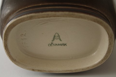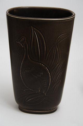 Vase i brun mat glasur med motiv af agerhøne og Dunhammer. Dek. 1712. Højde 21,5 cm. 9,5 x 14 cm. Pris: 475 kr.