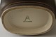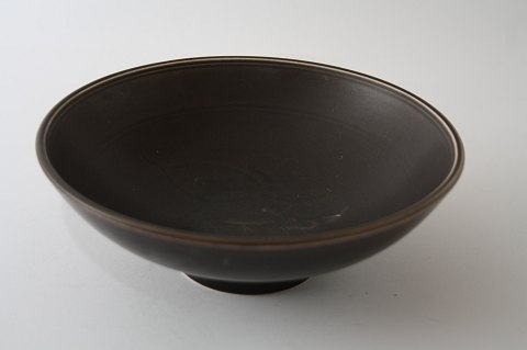 Skål i brun mat glasur med bladmønster indvendig i bunden af skålen. Dek.nr, 1614. Højde 6 cm. Diameter 18 cm. Pris: 275 kr.