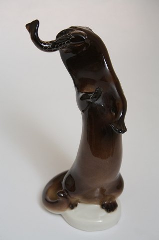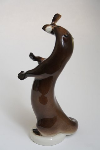 Russisk figur, stående brun Hermelin med fisk i munden. Længde 9 cm. Højde 21,5 cm. Pris: SOLGT