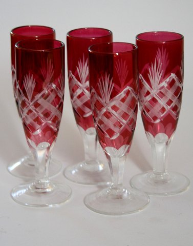 Bøhmisk krystalglas små glas. Højde 11 cm. Diameter 3 cm. Der forekommer lidt brugsslid i den røde farve. 5 stk sælges samlet for 300 kr.