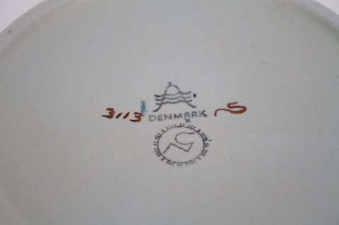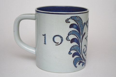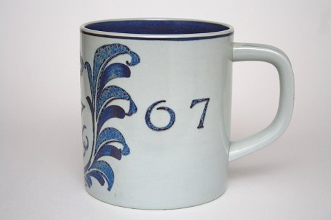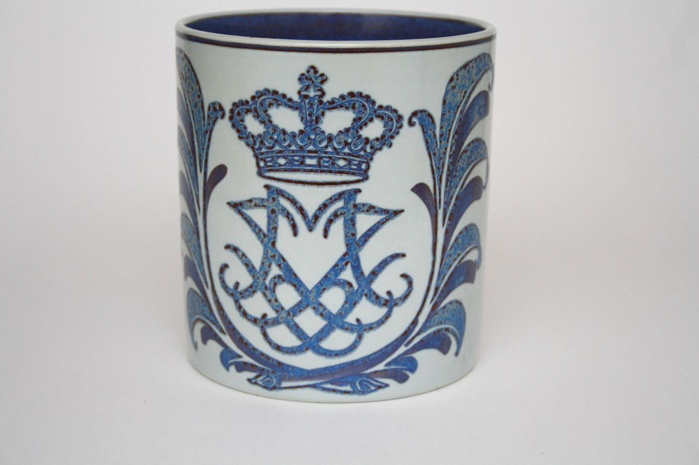 Royal Copenhagen ekstra stort årskrus fra 1967 med Dronning Margrethes monogram. højde 13,5 cm. diameter 12 cm. Designet af Nils Thorson. Dek, nr. 3113. Pris: SOLGT