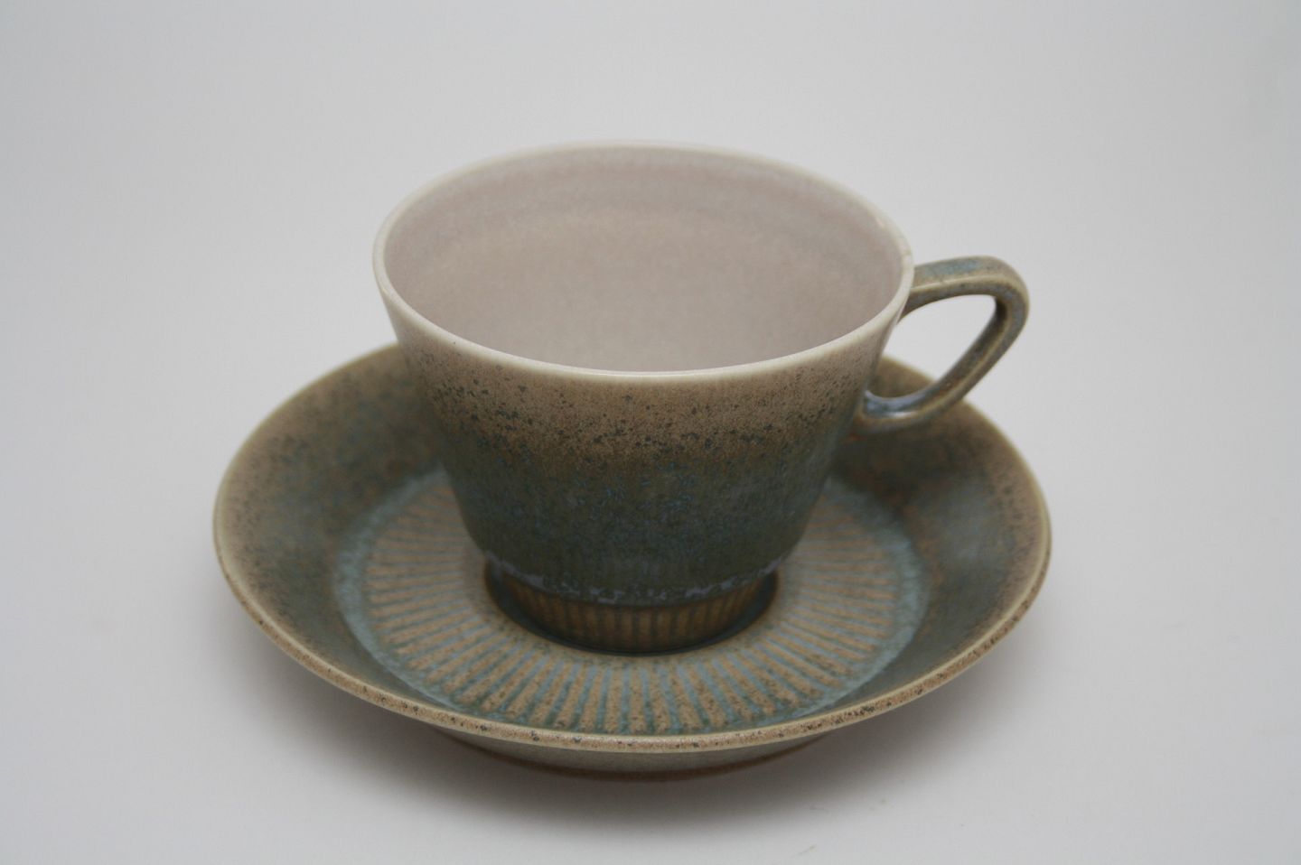 Knabstrup stoneware, Knabstrupstellet i azurfarvet glasur. Kaffekop med underkop. Højde 6,5 cm. Øverste diameter 8,5 cm. Underkop diameter 14 cm. Pris: SOLGT