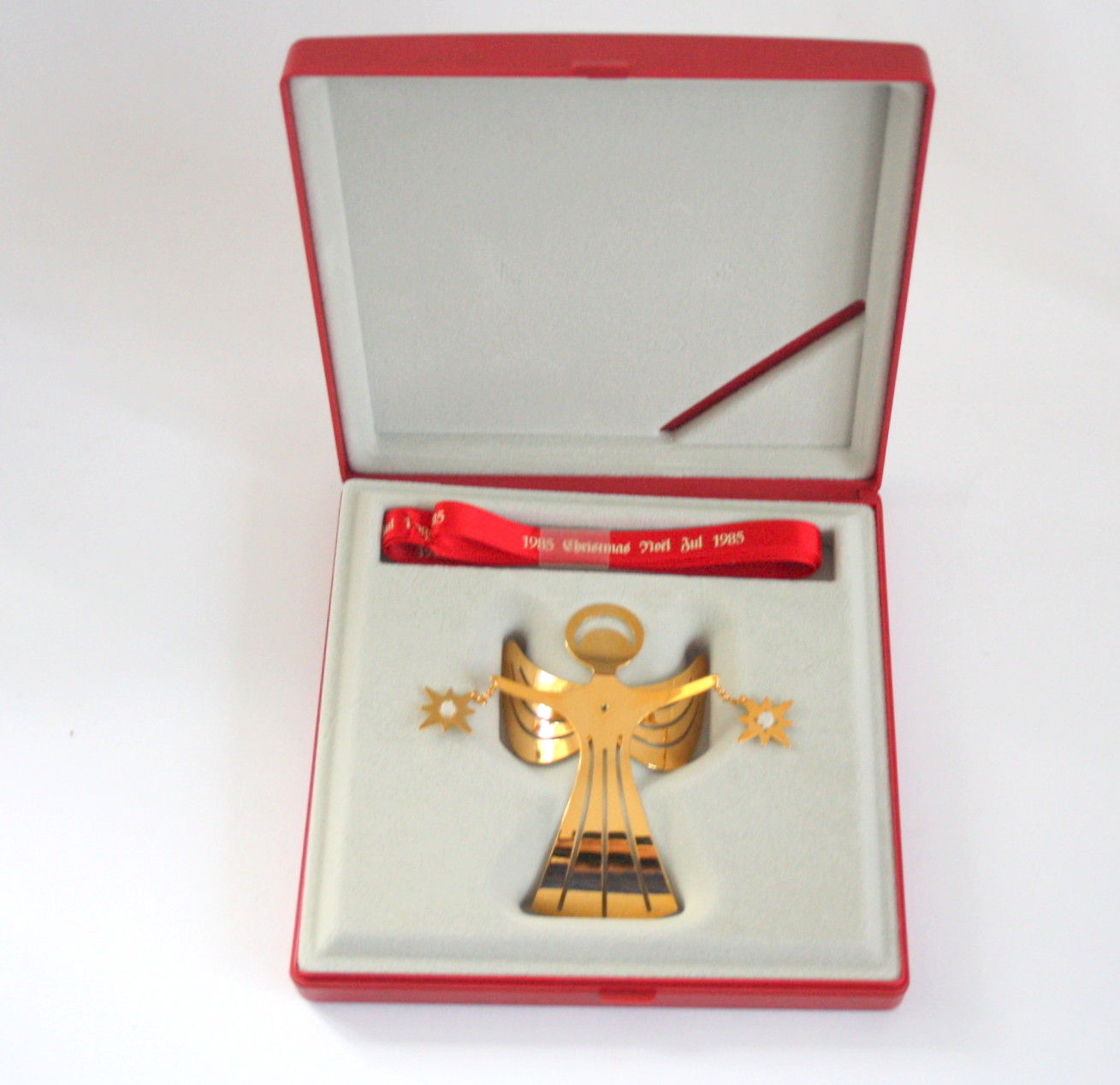 Georg Jensen, juleuro 1989, Engel. Juleuroen er udført i messing belagt med 24 karat guld. Originalæske med følger.
