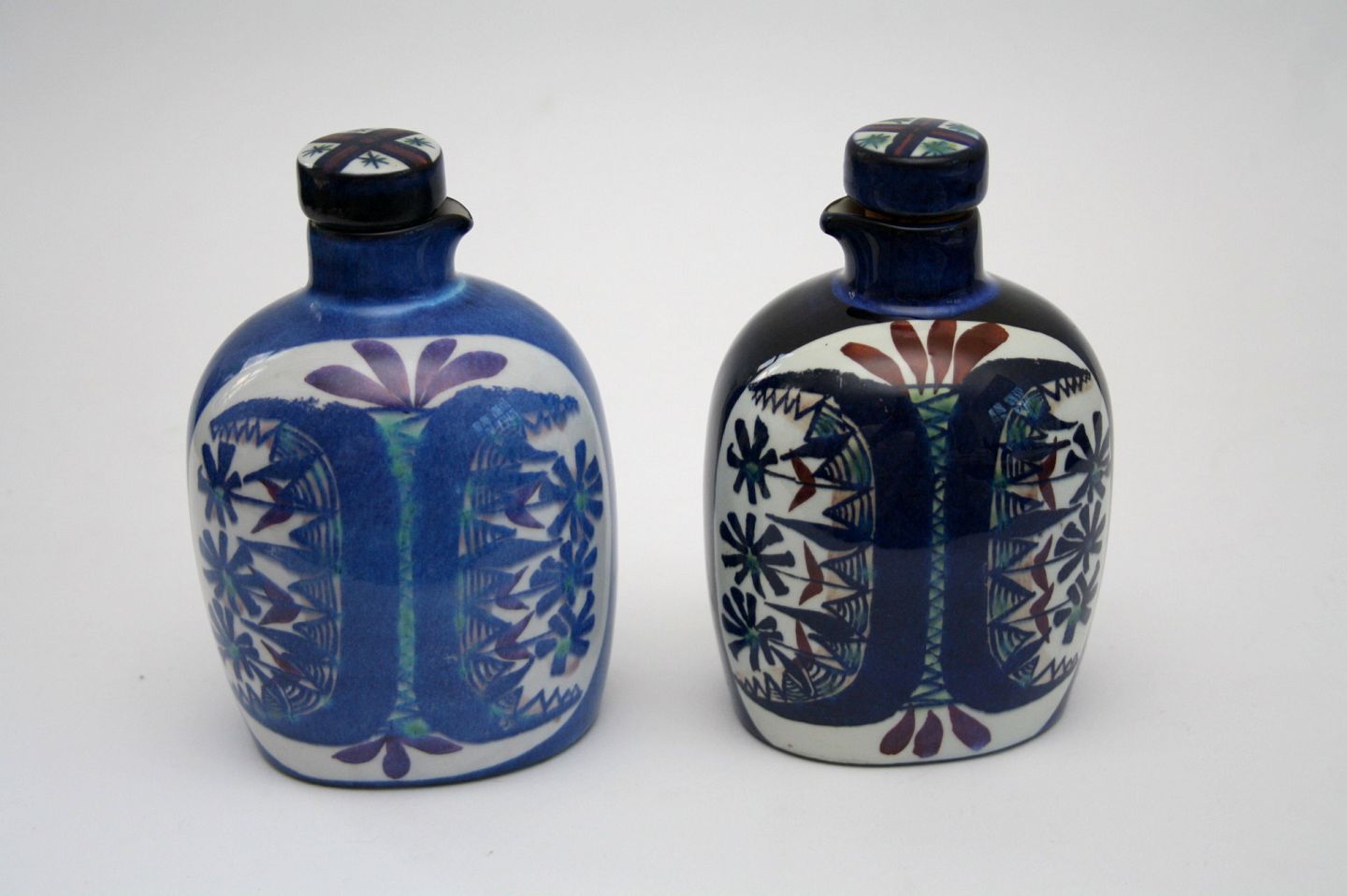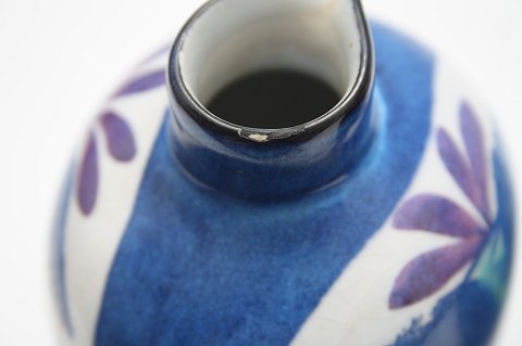 Aluminia. Lyseblå flaske med mørkeblå prop. Dek.nr. 153/2918. MJ. Lettere krakeleret og lille hak se foto. Højde ca 13 cm. Pris: SOLGT