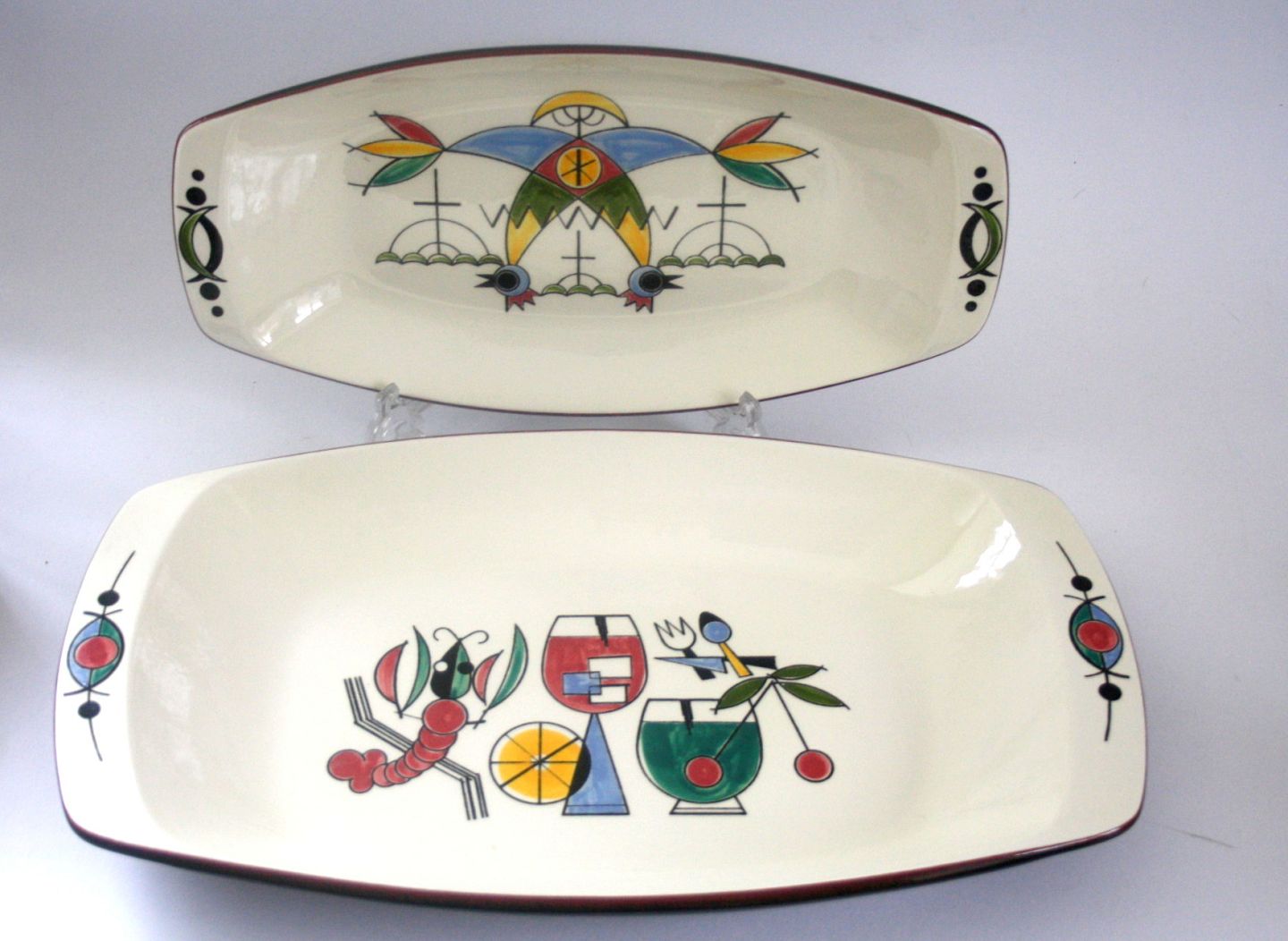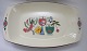 Knabstrup, Symfoni designet af Piotr Baro, formgivet af Johannes Hansen. I produktion i perioden 1959-61. Liggende fad forrest 39x23x4,5 cm. afslag bagpå se ekstra foto. SOLGT Stående fad bagerst.33x16x3,5 cm. SOLGT
