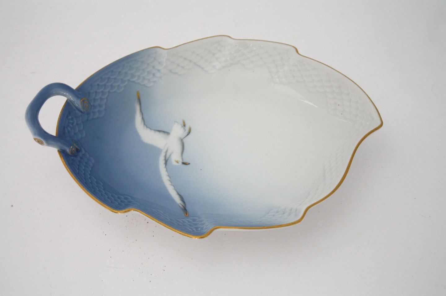 Bing & Grøndahl, Måge med guld. Bladassiet. Dek.nr. 199. II. sortering. Længde 24,5 cm. Bredde 19 cm. Pris: SOLGT