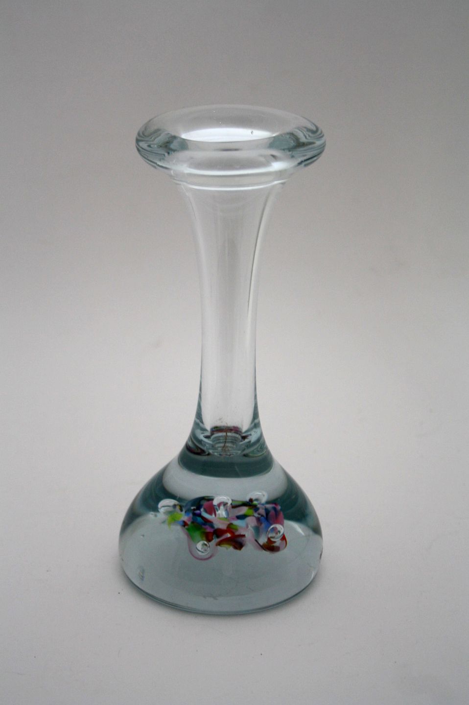 Holmegaard, Bone/knoglevase klart glas med indlejret blomst i flere farver. Designet af Per Lütken i slut 1980'erne. Højde 22 cm. Der er ridser 2 steder i foden. Pris: SOLGT