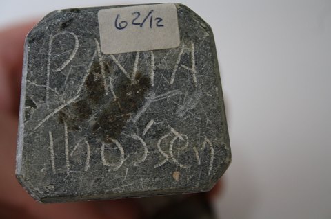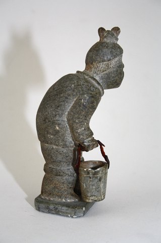 Grønlandsk figur i fedtsten, Grønlænder med spand. Figuren er udført af Anton Thorsen Paamiut (1927-1977) og signeret Pavia Thorsen. Højde 13,5 cm. God stand, dog er der slået lidt spanden og læderhanken er flosset. Pris: SOLGT