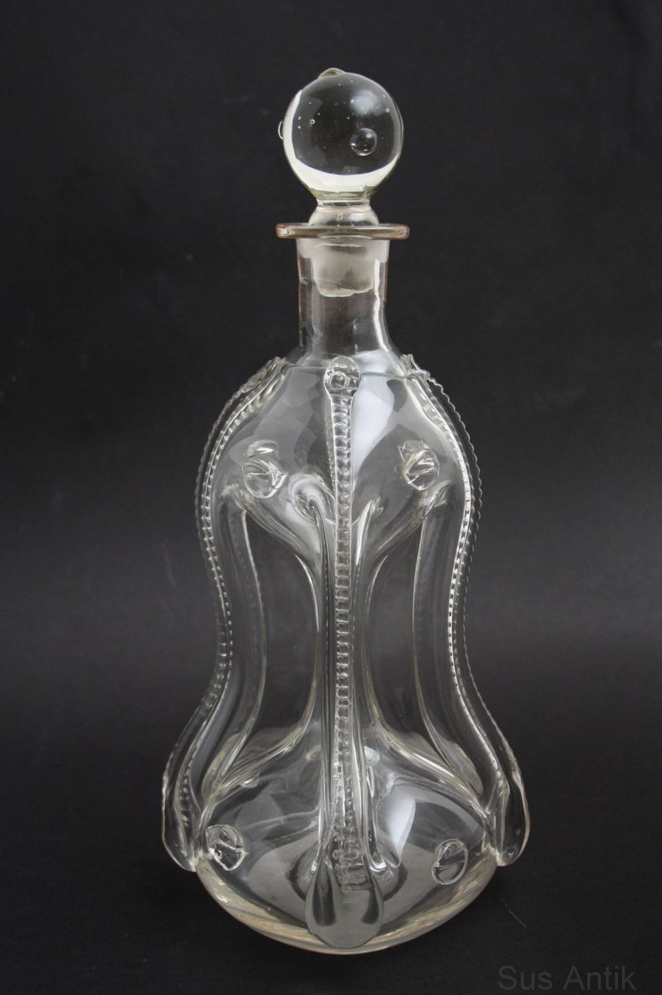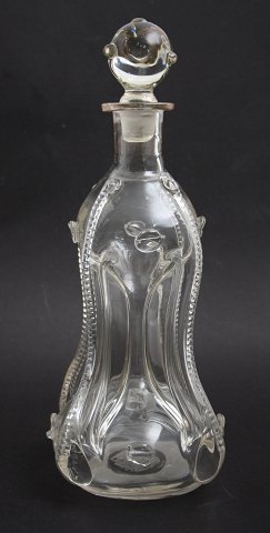 Stor Kluk kluk karaffel, med rigler og rosetter. højde 35cm. ca. omkring 1900 tallet, fin stand men proppen er lidt løs. afslag nederste del af proppen. Pris: SOLGT