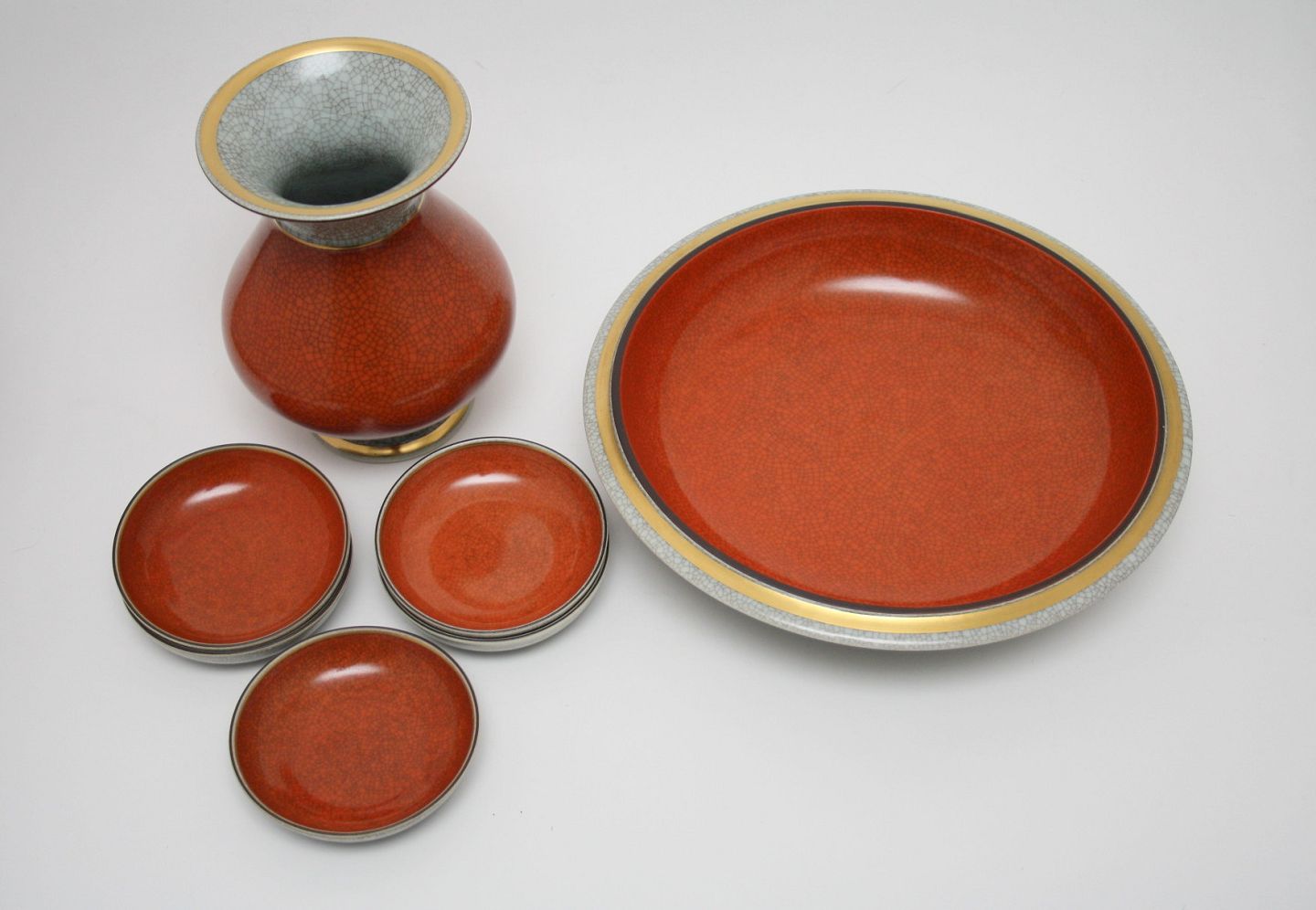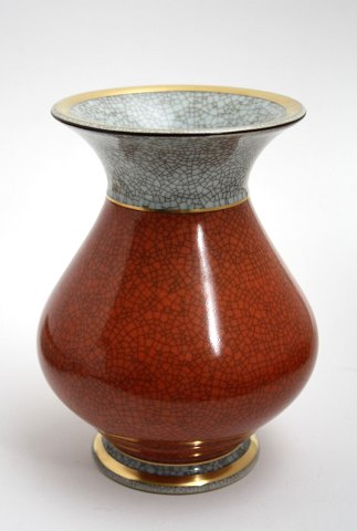 Royal Copenhagen, krakelé i orange og grå med guldkanter.