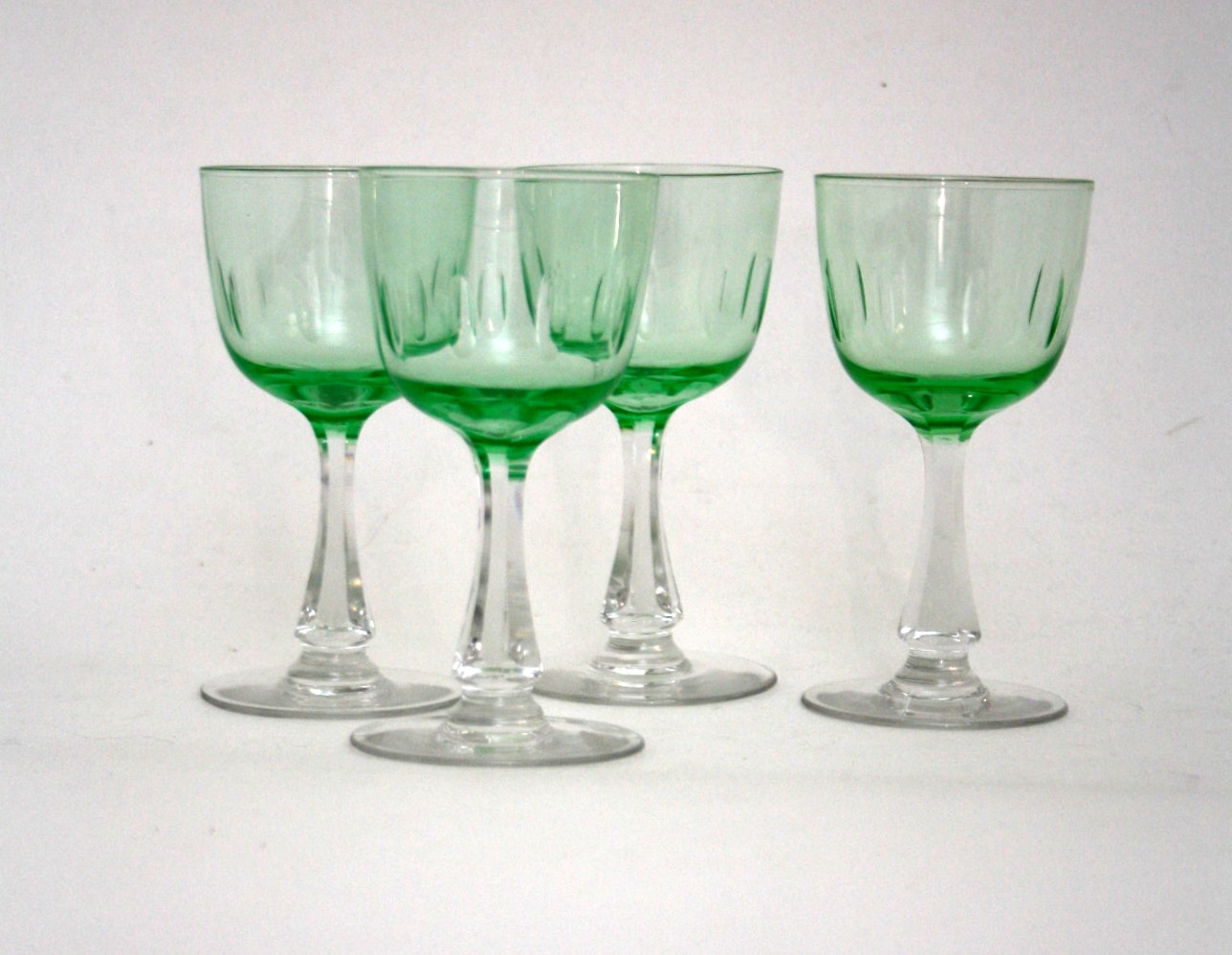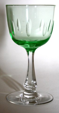 Derby grønne krystal hvidvinsglas. Højde 12,5 cm. Øverste diameter 6,5 cm. Der er kun 10 olive slibninger på glasset med et mellemrum på1,5 cm. Pris: SOLGT