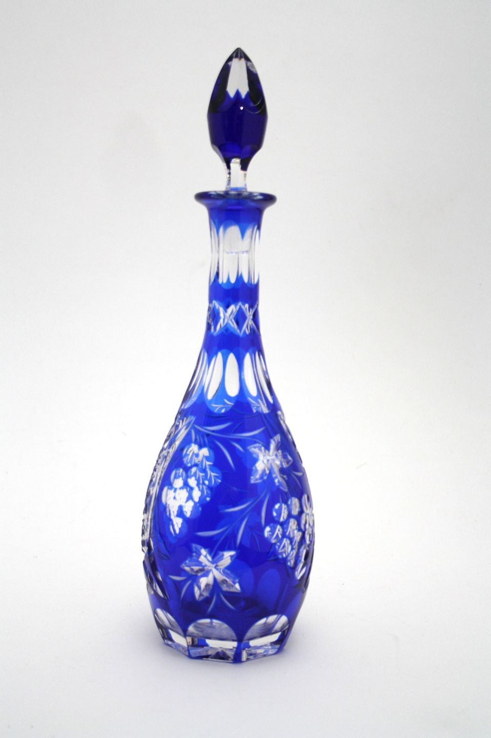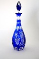 Blå Bøhmisk krystal karaffel med smukke slibninger. Højde med prop 33 cm. Flot stand dog med lidt kalkaflejring i bunden indvendig. Pris: SOLGT
