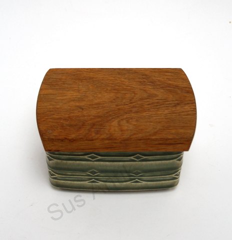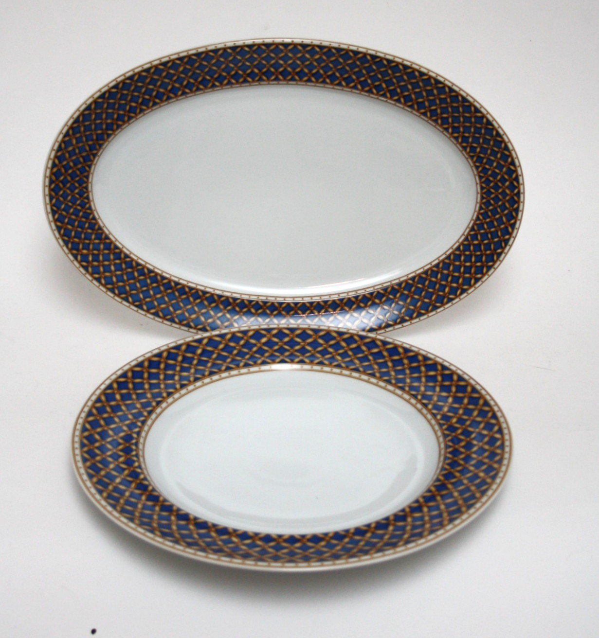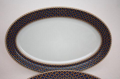 Ovalt fad. Mørkeblå ternet med guld. Dek.nr. 375. 39,5 x 26 cm. Pris: 650 kr. Lager: SOLGT