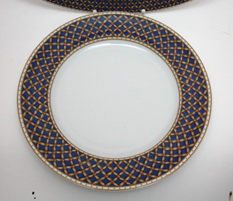 Flad stor tallerken/fad. Mørkeblå ternet med guld. Dek.nr. 631. Diameter 31 cm. Pris: SOLGT