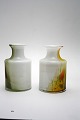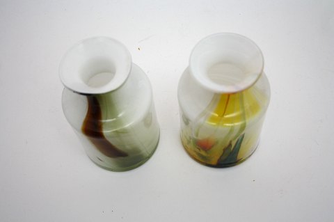 Holmegaard, Cascade vaser designet af Per Lütken i 1970. Mundblæst opalhvid glas med indlagte skår i forskellige farver. Højde 15 cm. Diameter 9 cm.