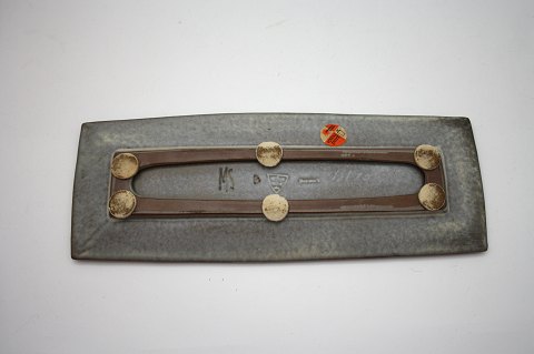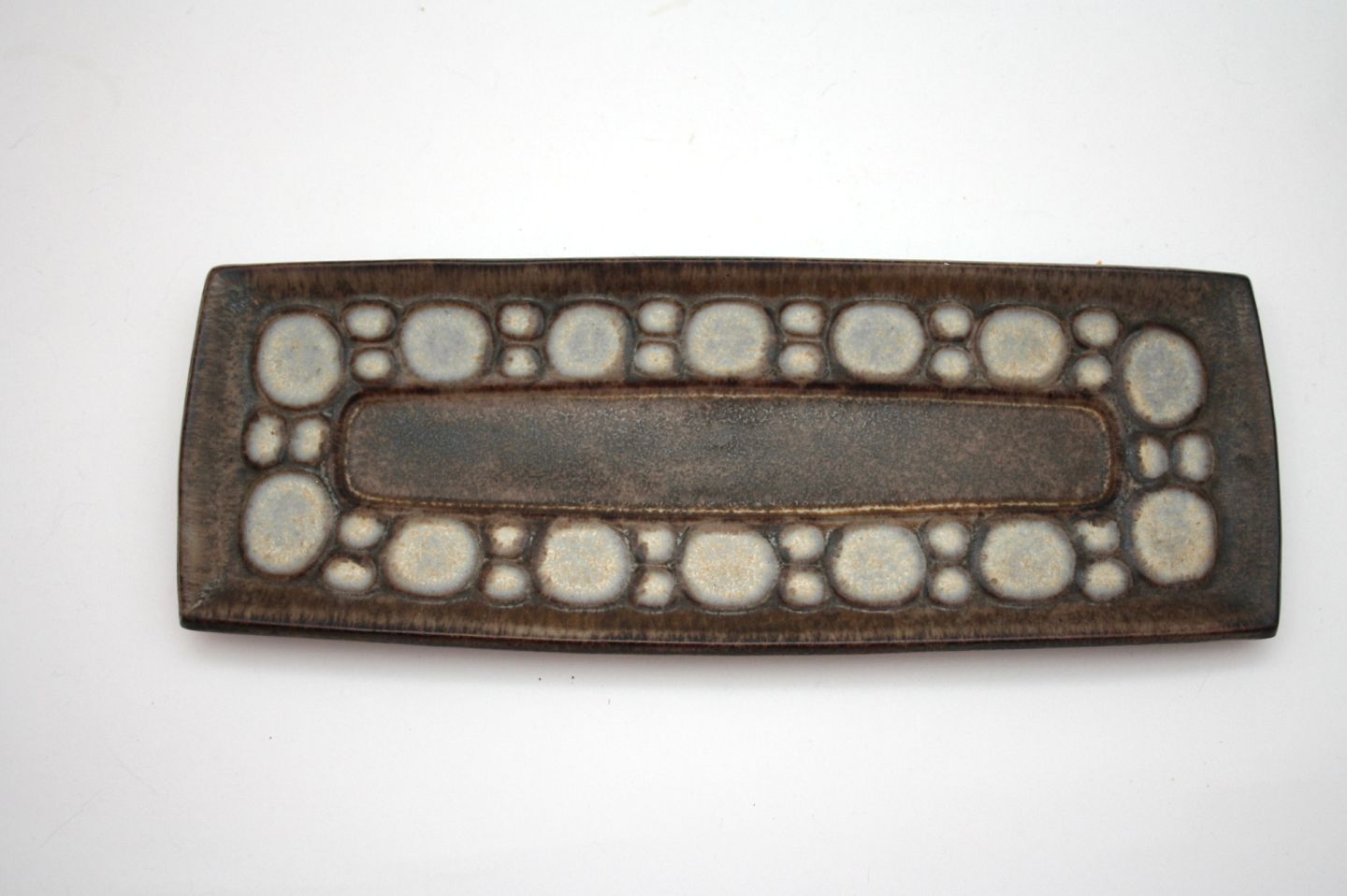 Michael Andersen, aflangt fad brun glaseret med lyse bobler designet af Marianne Starck. 34 x 12,5 cm. Pris: solgt