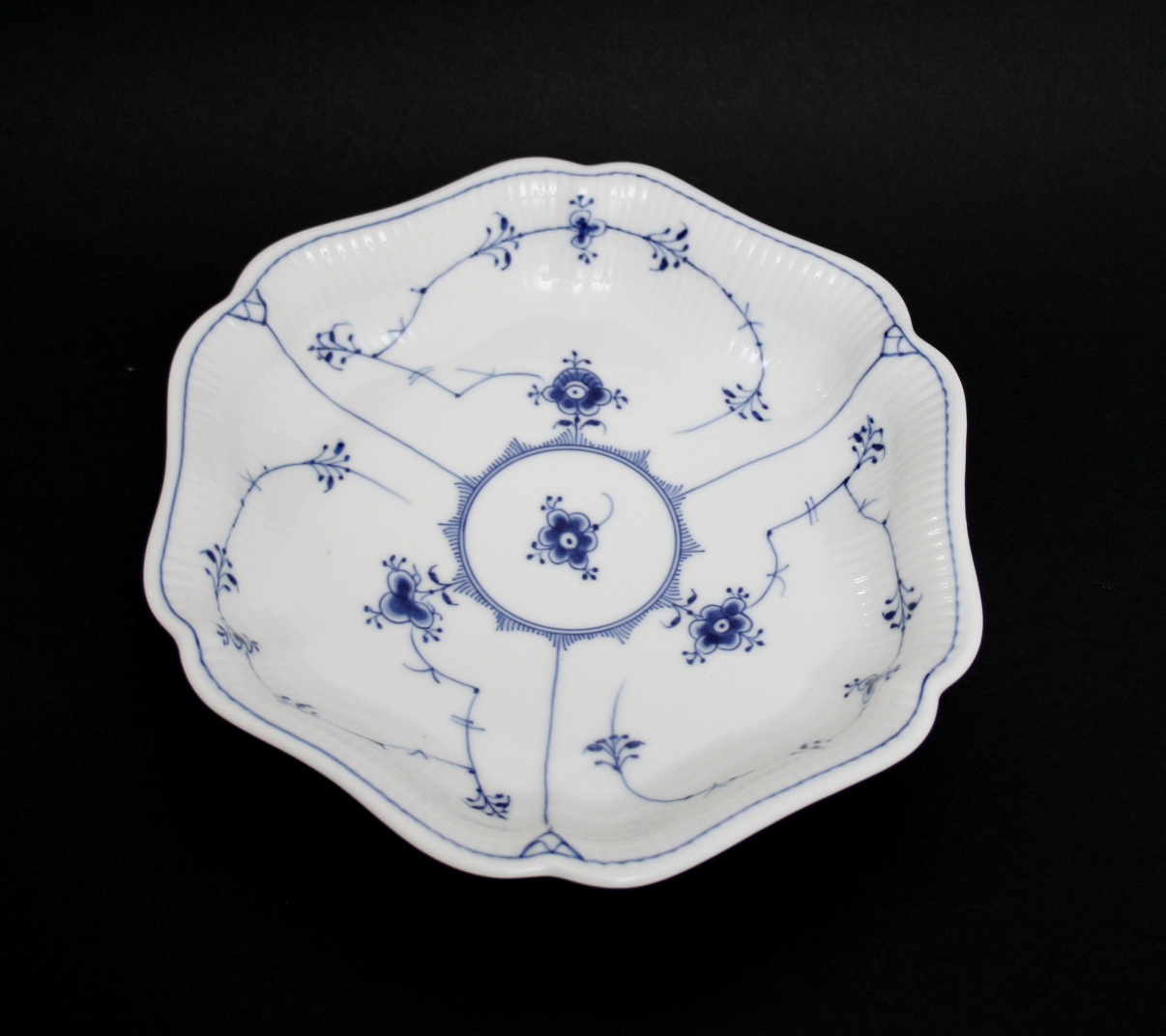 Royal Copenhagen, Musselmalet riflet. Sekskantet fad/slål. Formnr. 1-2195. Fra 1923 og fremefter. Diameter 23 cm. Højde 4 cm. Pris: SOLGT