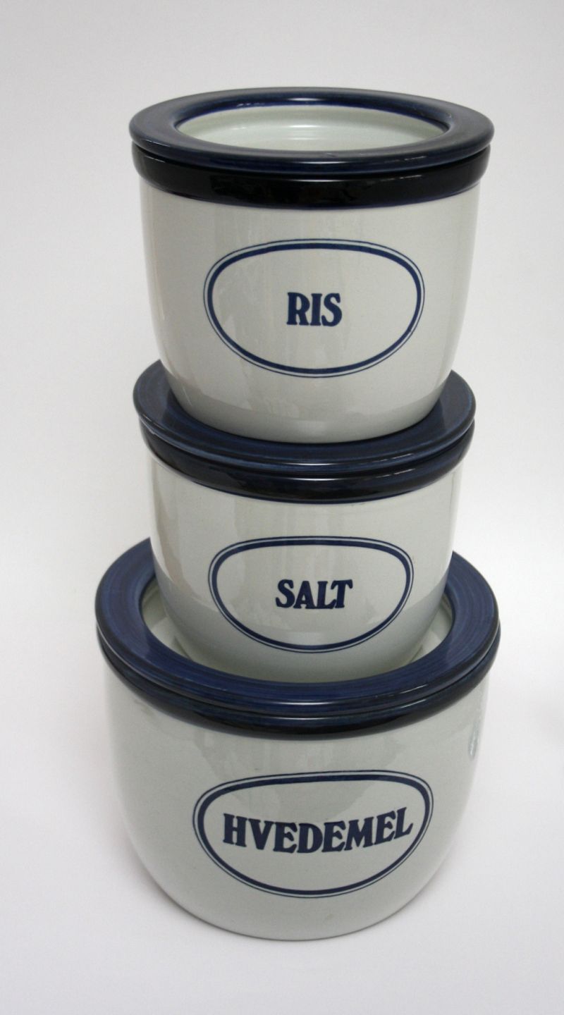Knabstrup, Blå Ribbon opbevaringskrukker med låg. Designer Inger Persson. Ris. Højde 15 cm. Diameter 18 cm. Pris: SOLGT Salt. Højde 15 cm. Diameter 18 cm. Pris: SOLGT Hvedemel. Højde 18 cm. Diameter 23 cm. Pris: SOLGT