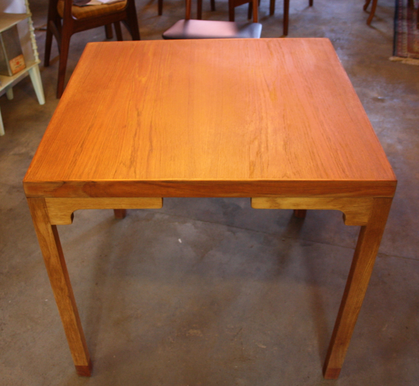 Hans Jørgen Wegner, kvadratisk spisebord teak finer plade. Stellet er i massivt eg med teaksko. 80 x 80 cm. Flot stand. Højde 73,5 cm. Pris: SOLGT