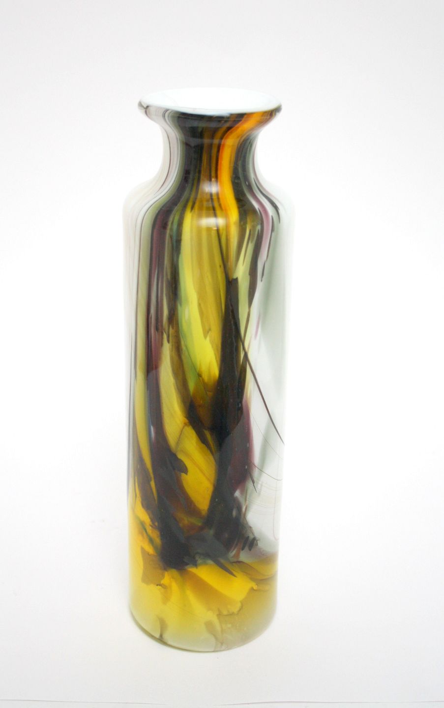 Holmegaard, Cascade vase designet af Per Lütken i 1975. Mundblæst opalhvid glas med indlagte skår i forskellige farver. Højde 28 cm. Diameter 8 cm. Signeret HG 5, PL. (1975). Pris: solgt