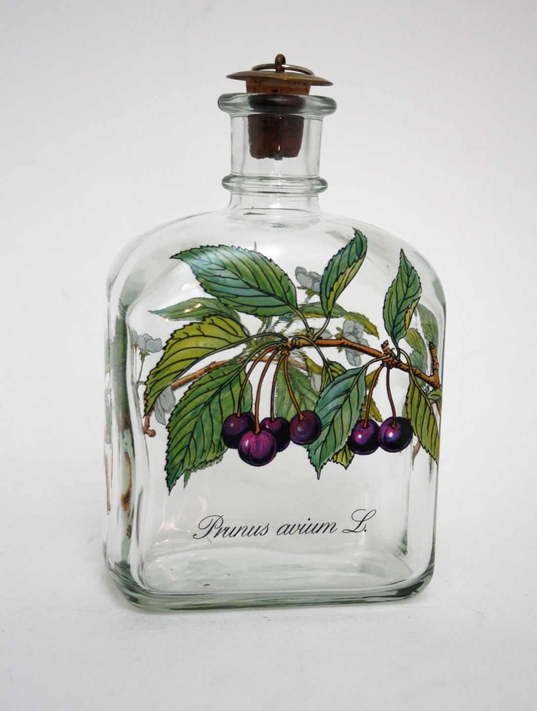 Holmegaard, Brændevins Amatøren, med fuglekirsebær motiv. Prunus avium. Designer Michael Bang. Højde 16 cm. Pris: SOLGT