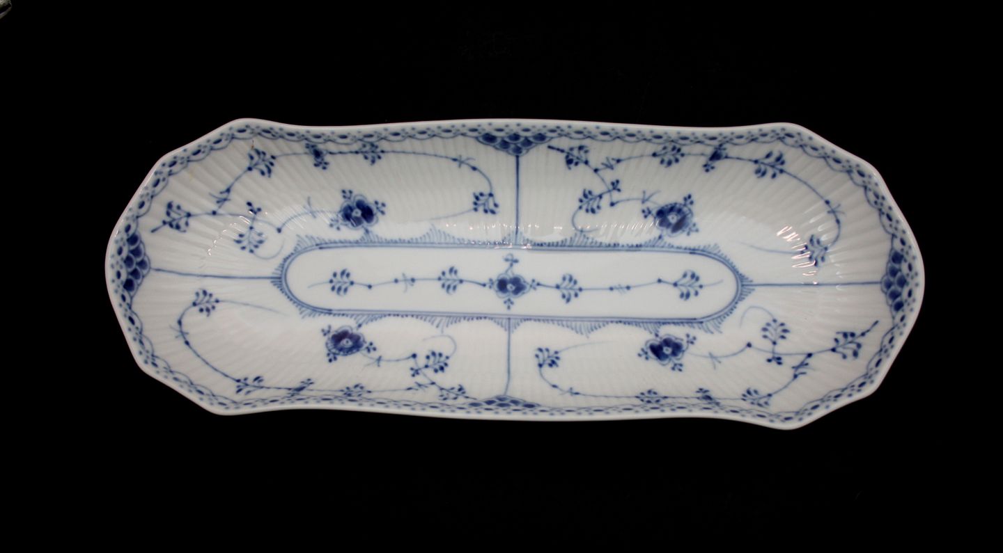 Royal Copenhagen, Musselmalet halvblonde, Rouladefad. Nr. 1/714. II. sortering. 36,5 x 14 cm. Flot stand. Pris: SOLGT