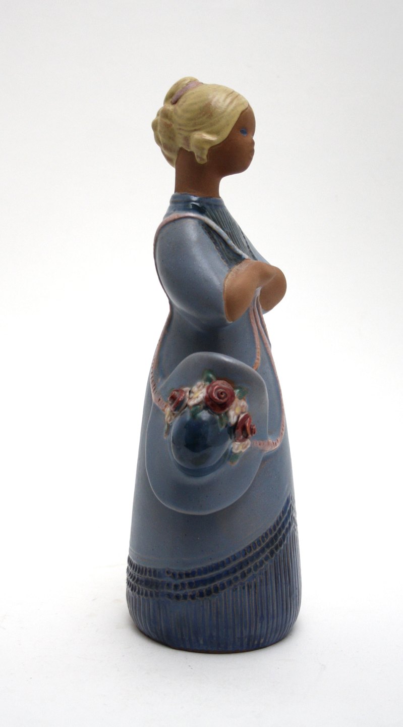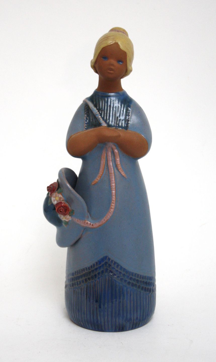Jie keramik, Sweden, Ung kvinde i blå kjole designet af Elsi Bourelius. Højde 30,5 cm. Pris: SOLGT