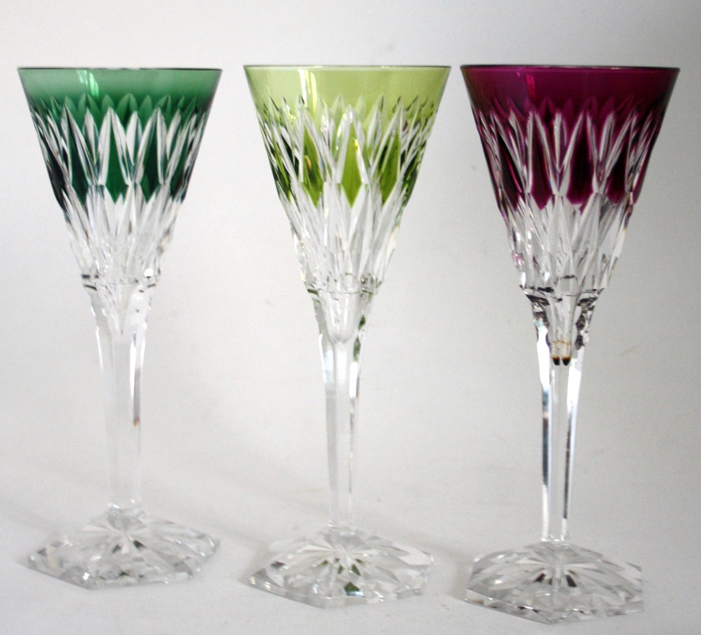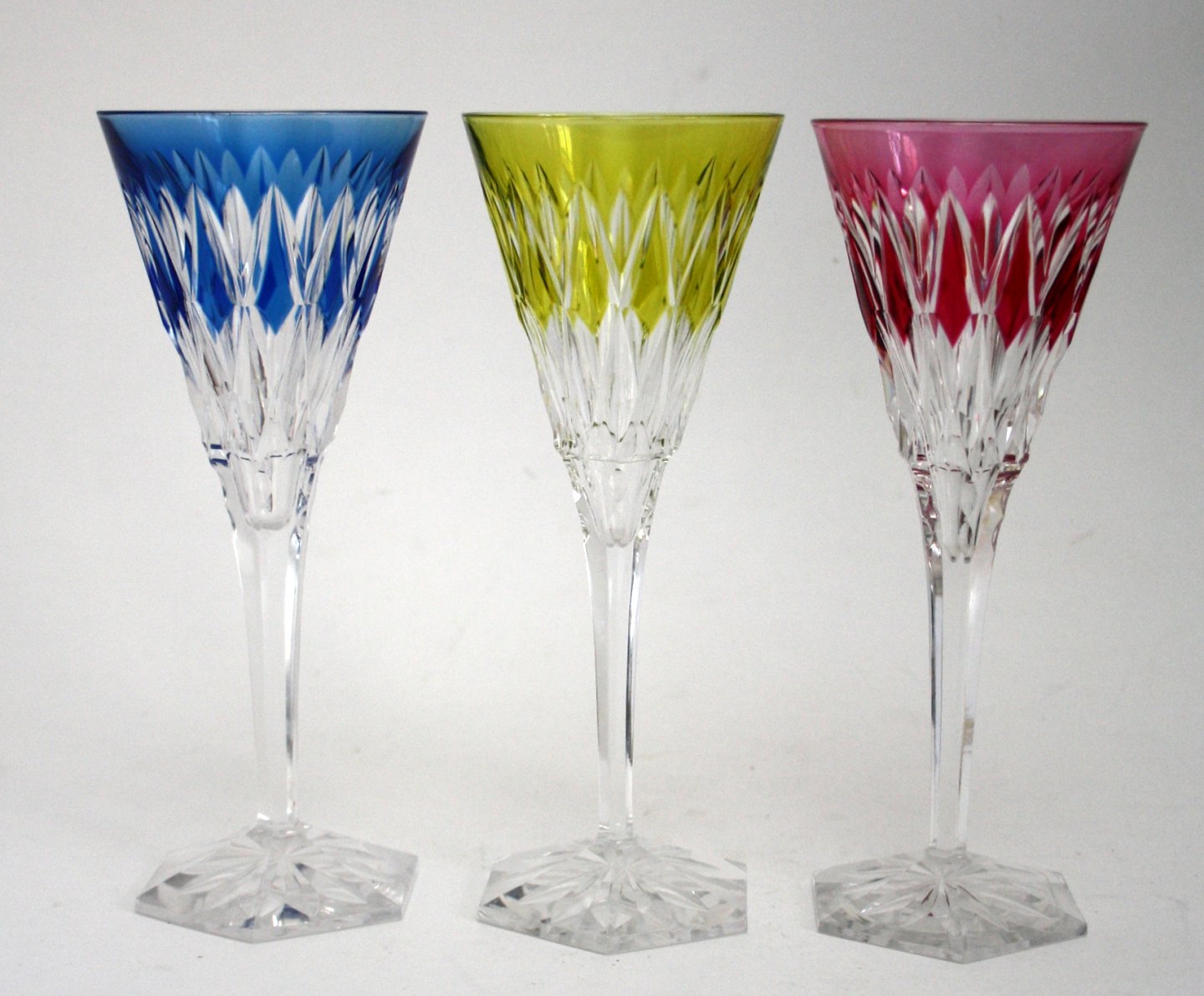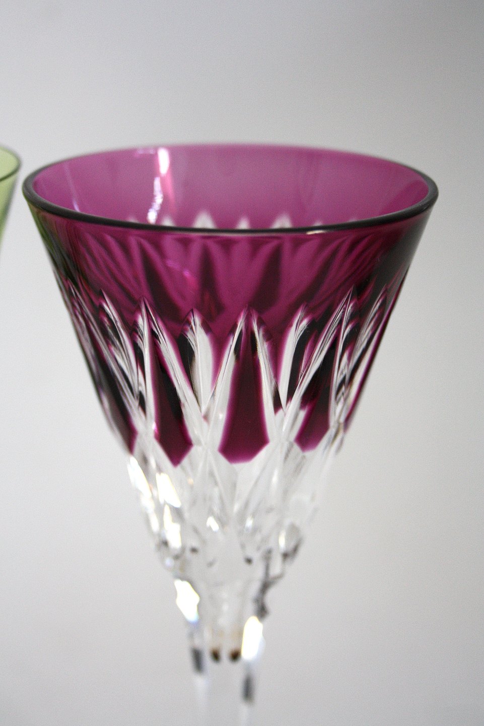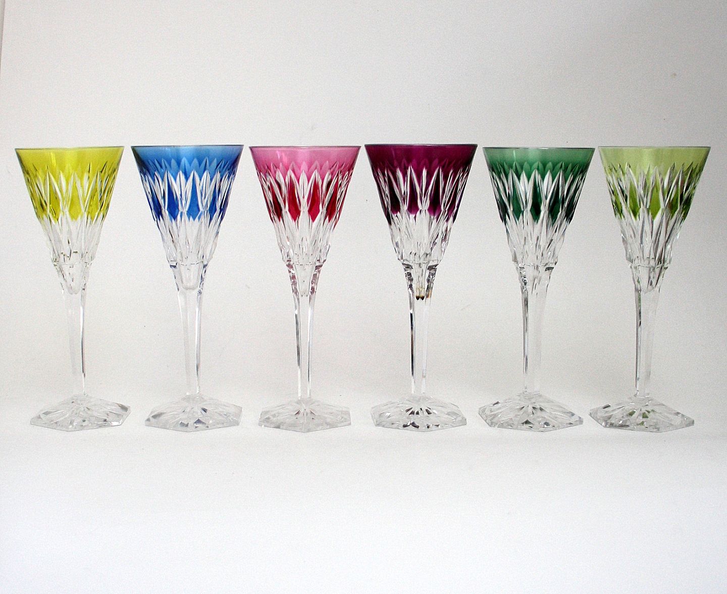 Val st. Lambert, Belgien Hafnia, farvede krystal champagneglas. Fantaisie slibning på kumme og stilk og 6 kantet fod. Højde 20 cm. Øverste diameter 8 cm. Signeret Val st. Lambert i bund. Glassene er fra 1950'erne. Alle i flot stand. Pris: solgt