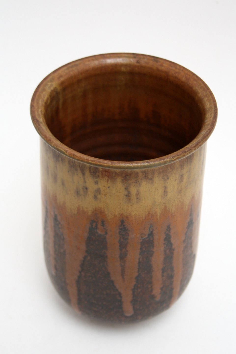 Arne Bang, Vase i mat løbeglasur i jordfarver. Signeret AB 76. Højde 19 cm. Øverste diameter 12,5 cm. Perfekt stand. Pris: SOLGT