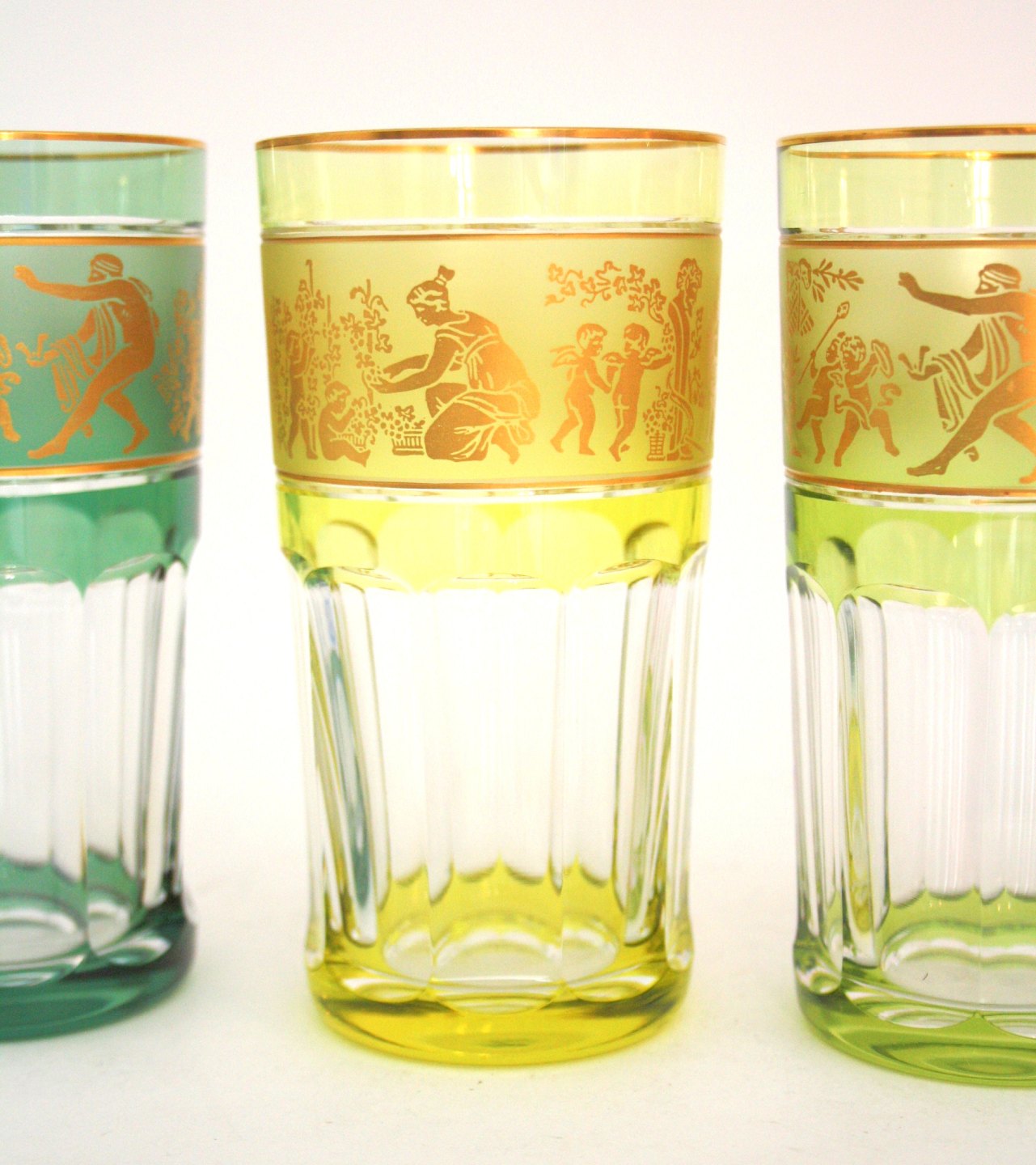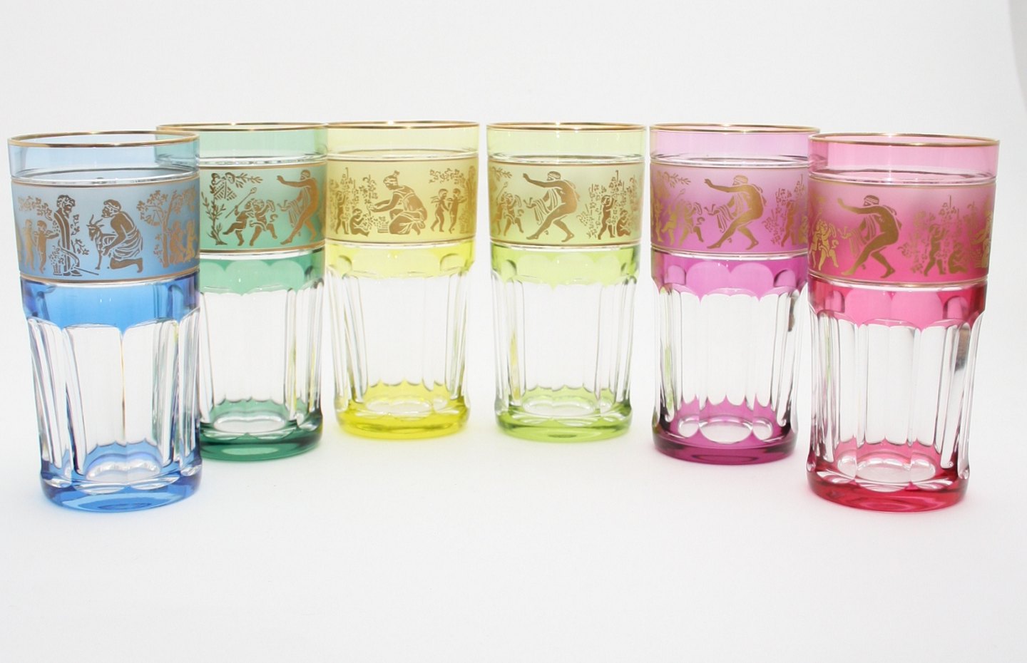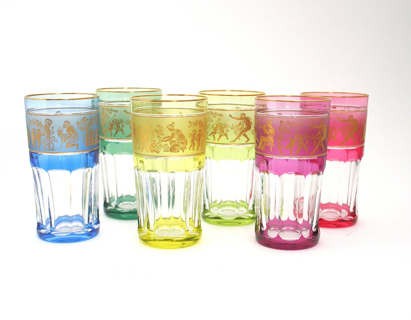 Val st. Lambert, Belgien, Danse de Flore krystal drikkeglas med 24 karat gulddekoration i 6 forskellige farver. Højde 13,5 cm. Øverste diameter 7 cm. Perfekt stand. Pris: SOLGT