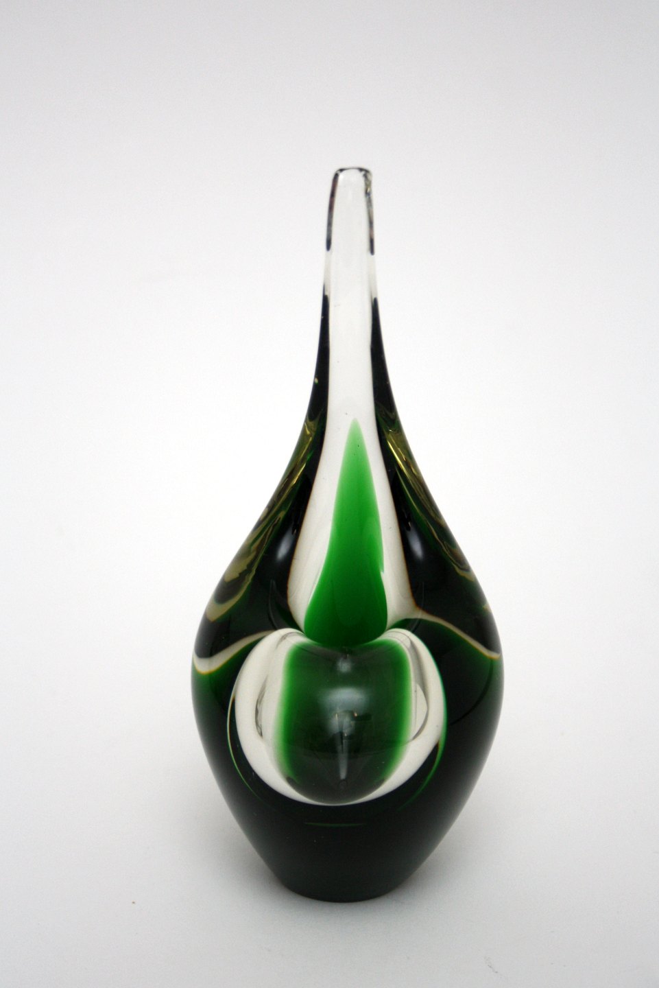 Holmegaard, Flamingo serien, Orkidévase i grønt og klart glas. Designet af Per Lütken i 1957. Signeret Holmegaard, 19PL57. Højde 16,5 cm. Flot stand. Pris: SOLGT