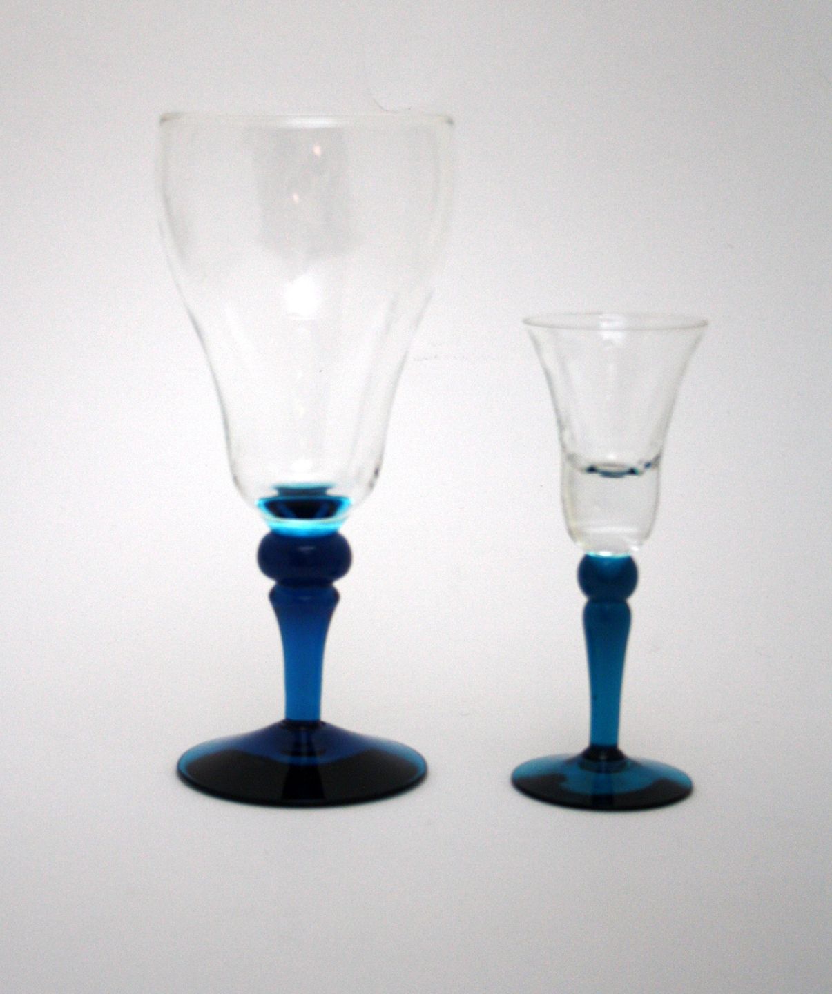 Kastrup Glasværk 1960erne. Hollandske snaps og ølglas med oceanblå stilk og klar kumme. Ølglasset findes ikke i noget katalog, har været en bestillingsvare.