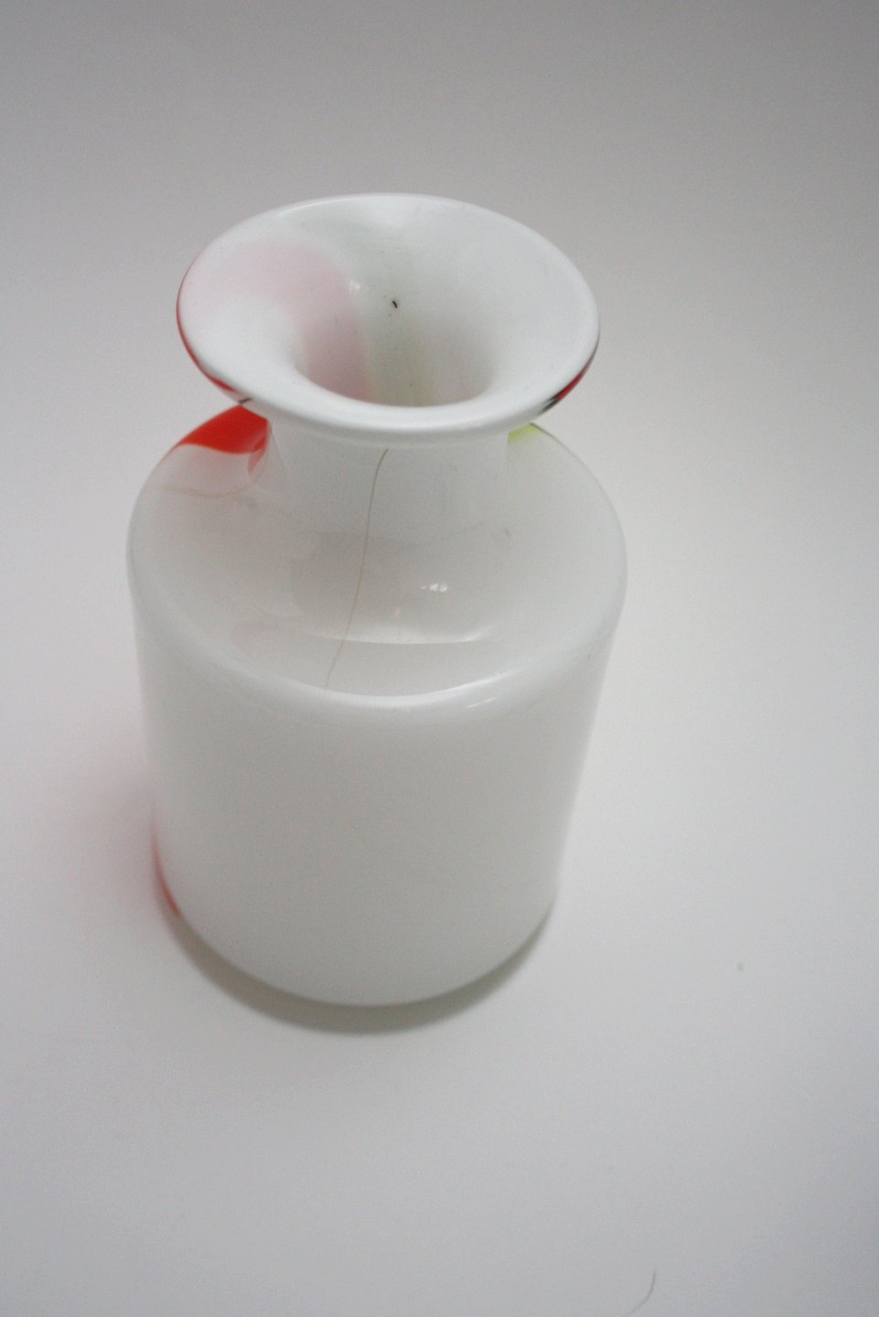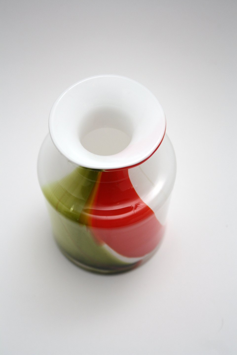 Holmegaard, Cascade vase designet af Per Lütken i 1970,erne. Mundblæst opalhvid glas med indlagte skår i rød og sart grøn farver. Signeret HG6.