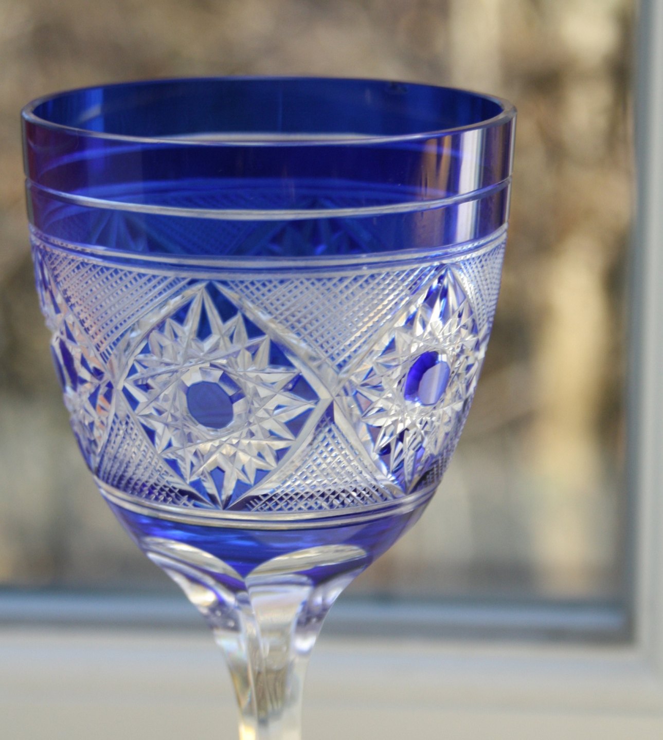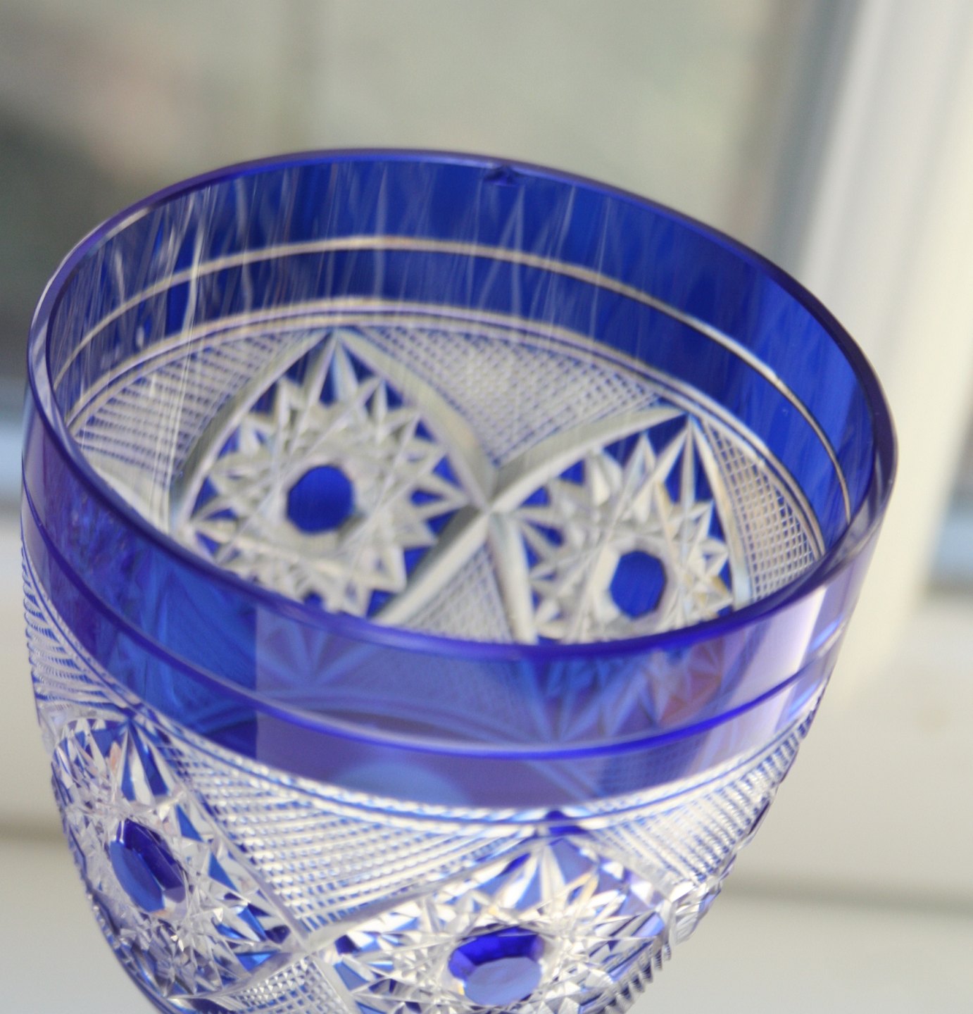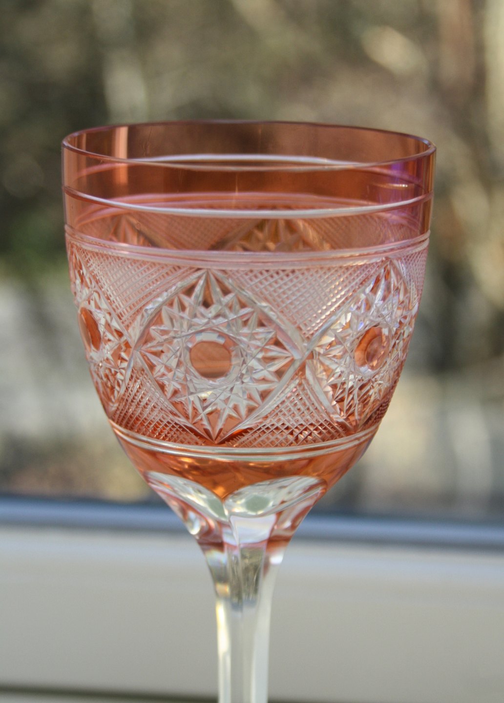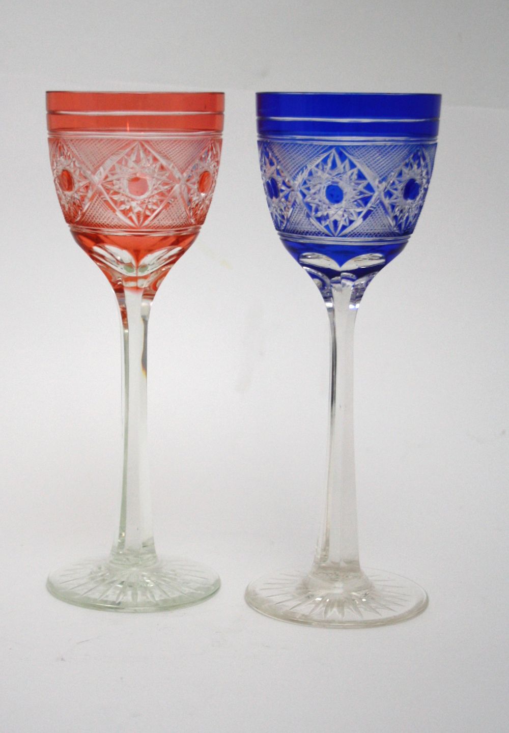 Bøhmisk krystal, Vinglas laksefarvet og blå. Højde 20,5 cm. Diameter 7 cm. Det blå har et lille afslag på indersiden. Sælges samlet for 300 kr. J2