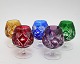 Bøhmiske cognac glas, højde 12 cm. øverste diameter 6 cm. i farverne rød blå grøn lilla gylden. Pris: SOLGT