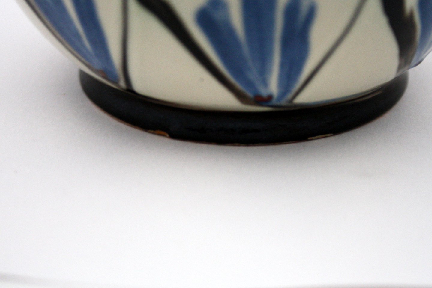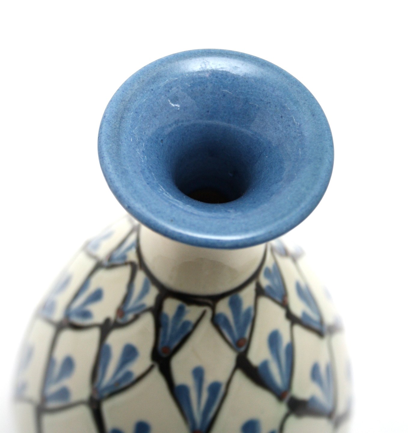 Kähler, smuk vase i cremet og lyseblå glasur. Signeret HAK made in Denmark. Højde 23,5 cm. Flot stand. De 2 mindre glasurafslag i bunden er formentlig fra fremstillingen. Pris: solgt