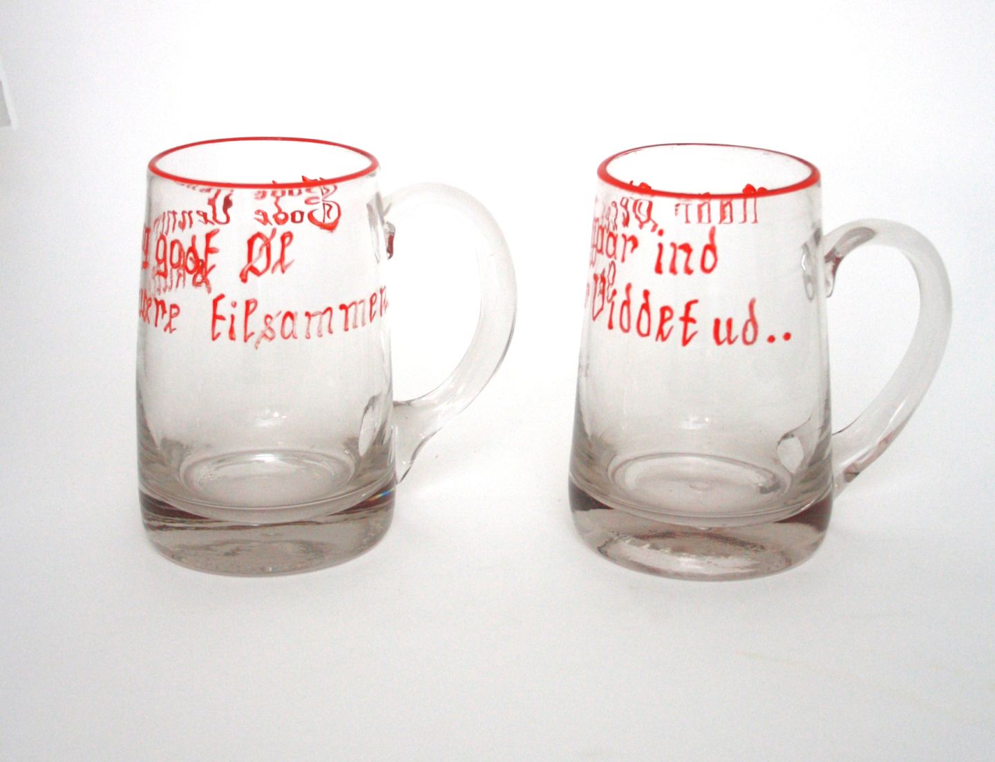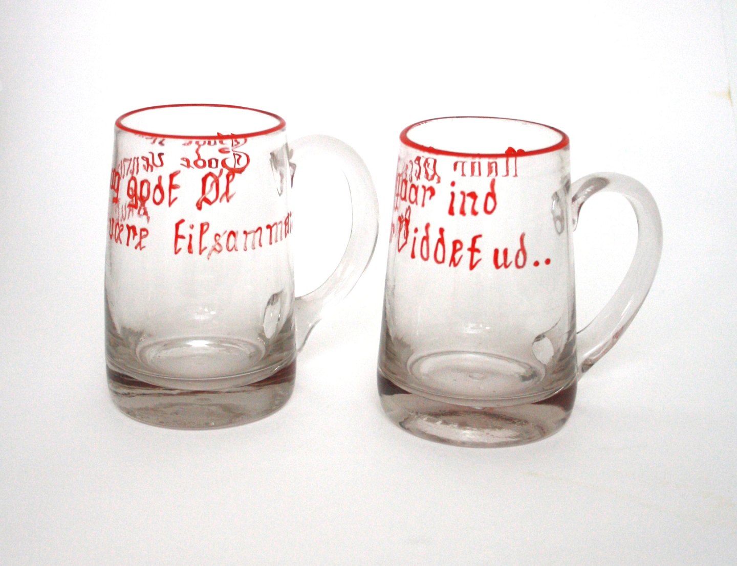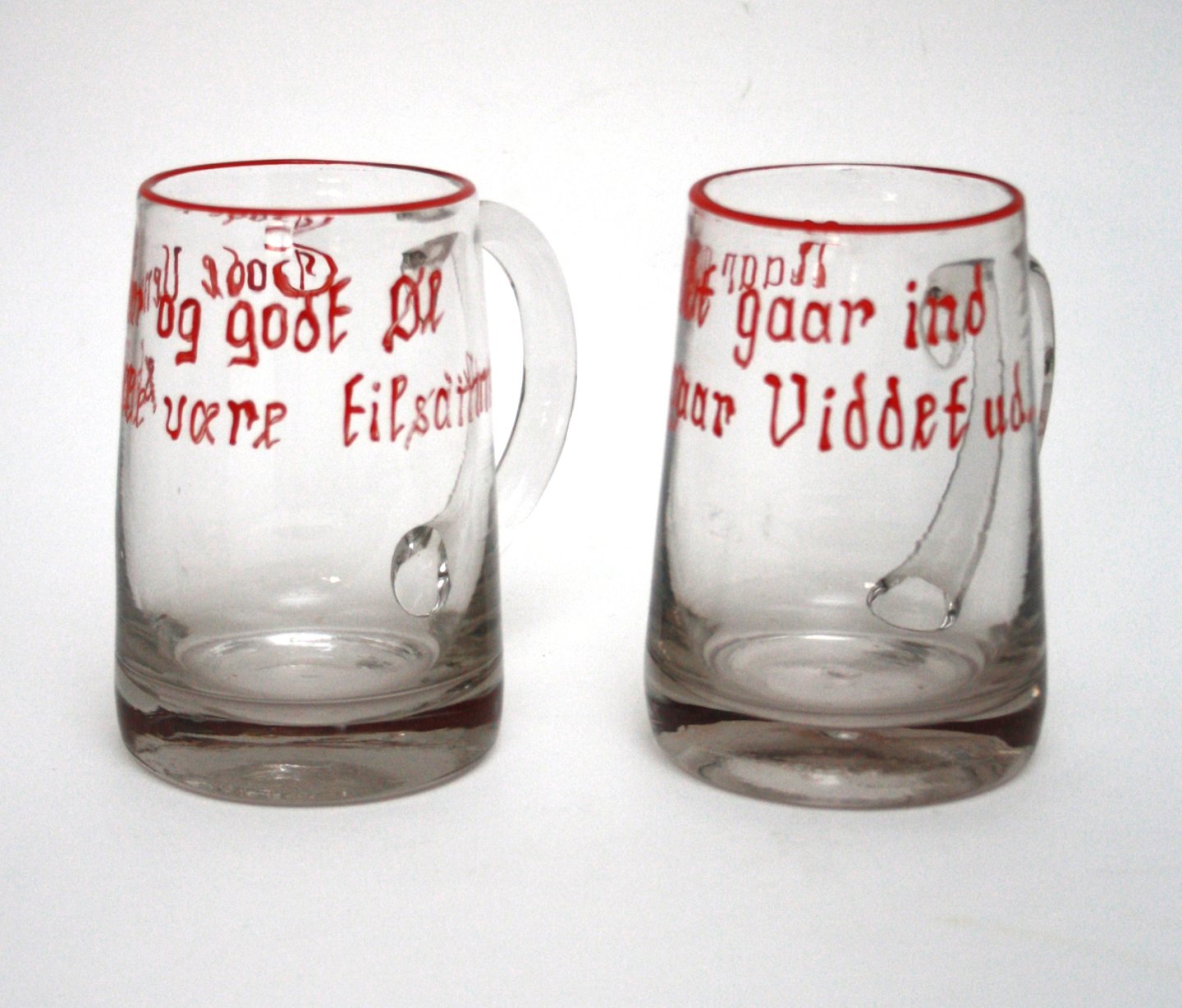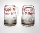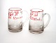Holmegaard, emaljebemalede ølkrus til kantineflasker. Designet af Jacob E Bang, produceret fra 1937-1957. Højde 12 cm. Pris: SOLGT Tv. Tekst: "Gode Venner og godt Øl skulle være tilsammen.." Th. Tekst: "Naar Øllet gaar ind gaar Viddet ud .."
