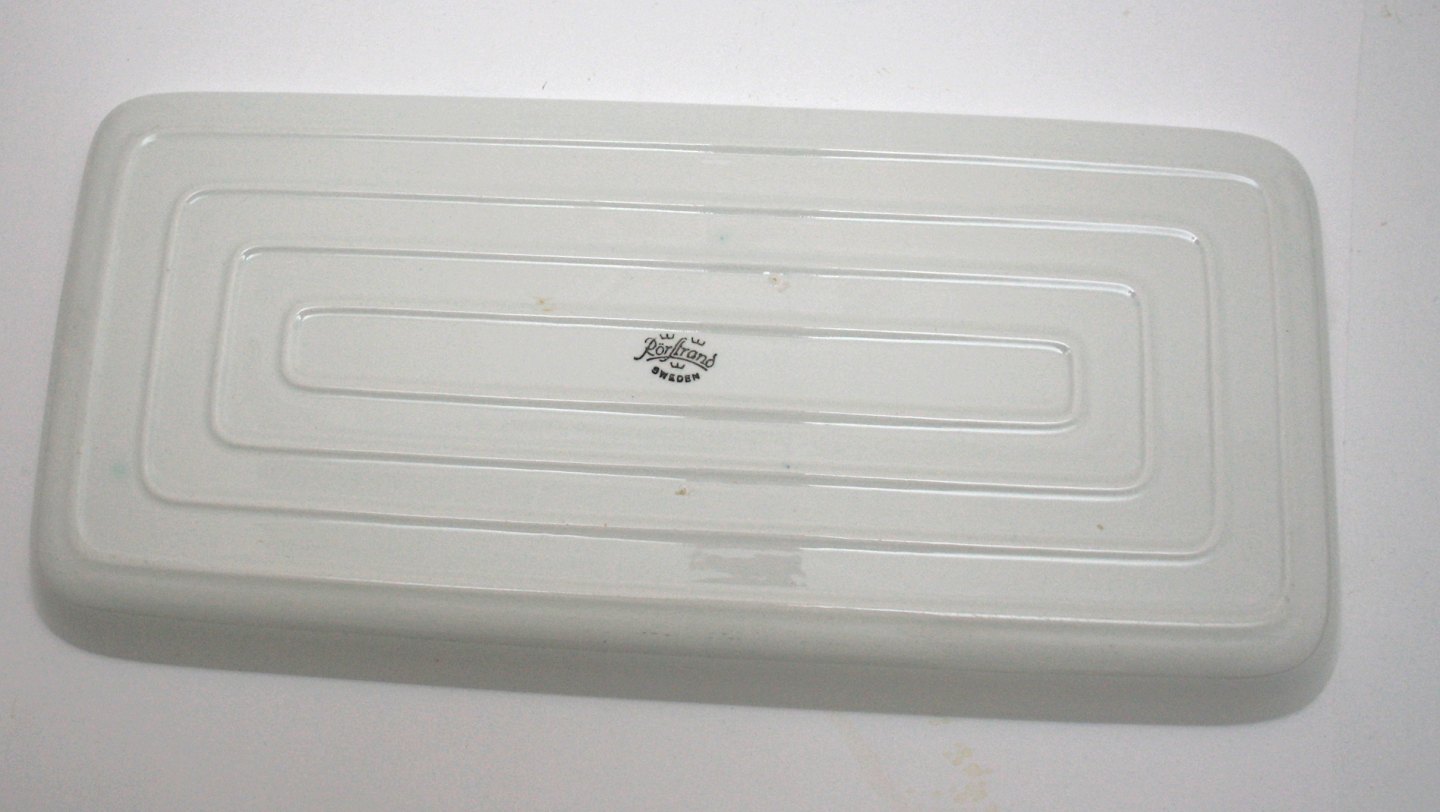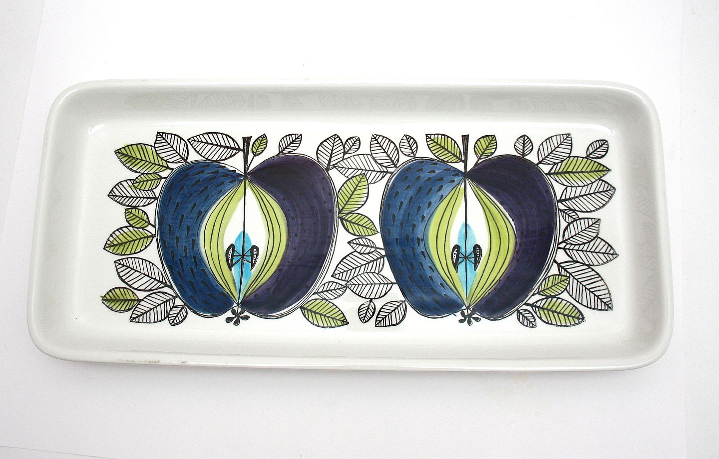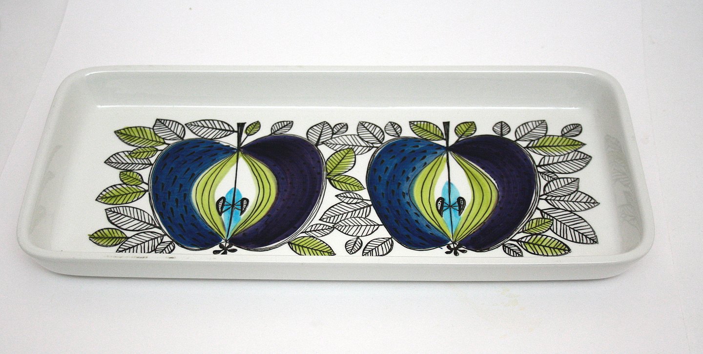 Rørstrand, Sweden, Eden, Aflangt fad med halve æbler. Designet af Sigrid Richter i starten af 1960'erne. Længde 41 cm. Bredde 17,5 cm. Højde 3,5 cm. Flot stand med en lidt sort på den ene kant. Pris: SOLGT