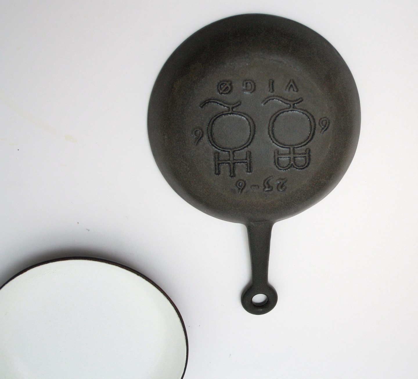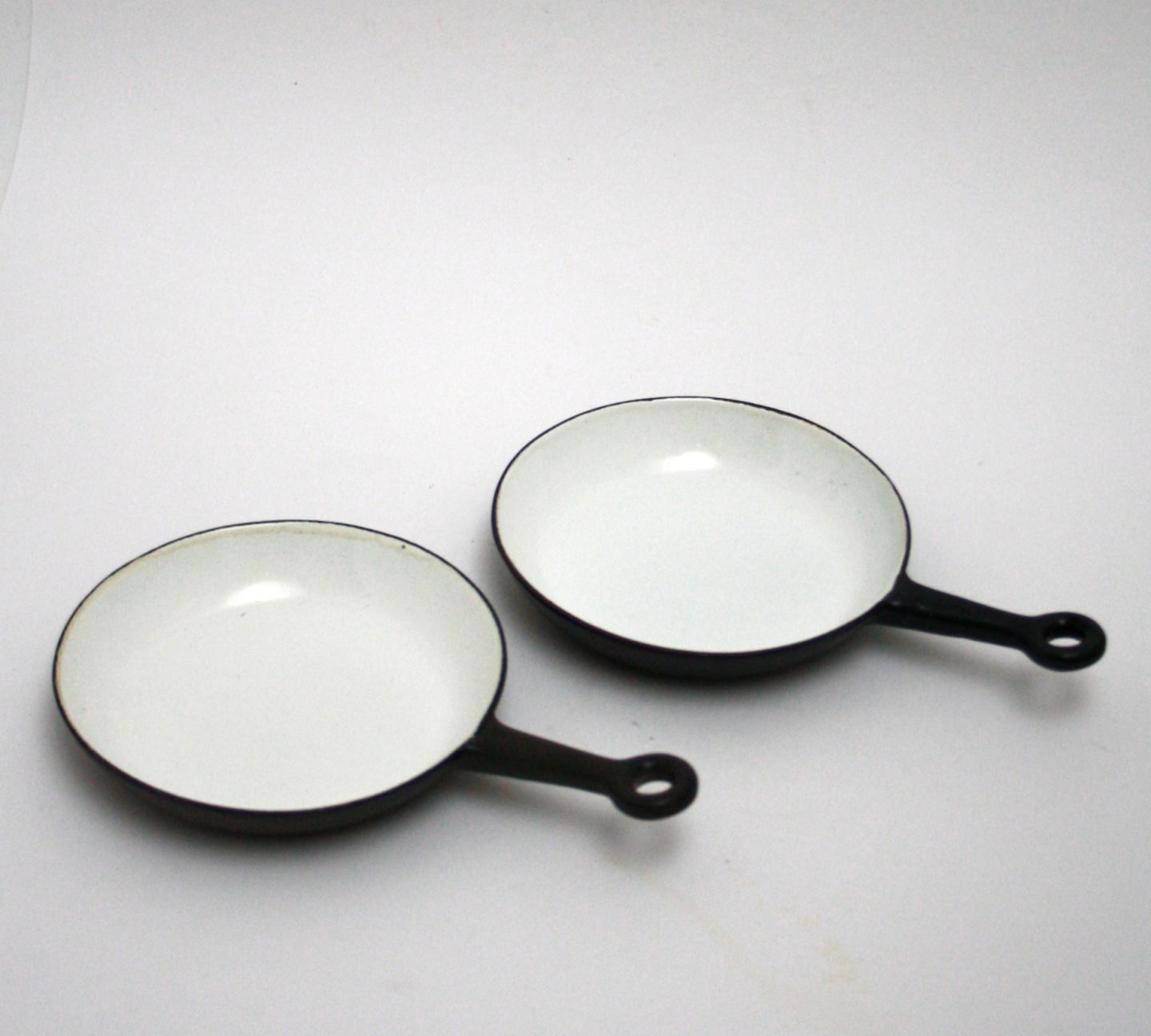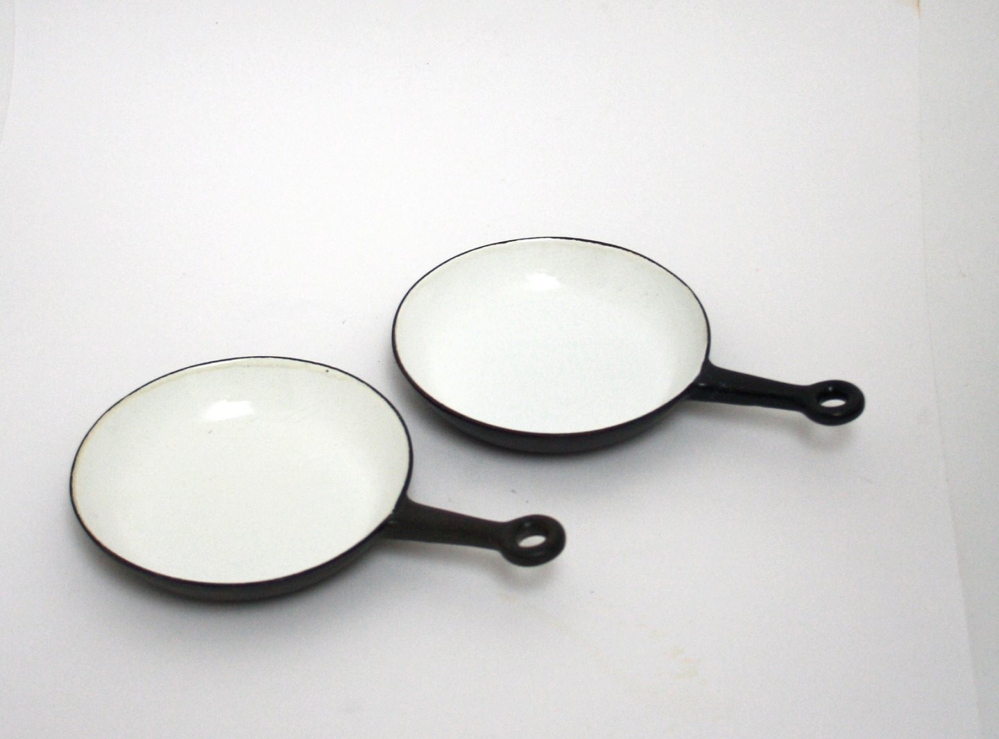 Jens Harald Quistgaard, Vigø små smedejernspander med hvid emalje. Diameter 13 cm. Længde 19,5 cm. Panderne er formentlig fremstillet til en begivenhed den 23.6 1966. Vigø er en lille privatejet ø ud for Fyn, som Quistgaard ejede i 40 år frem til 2002.