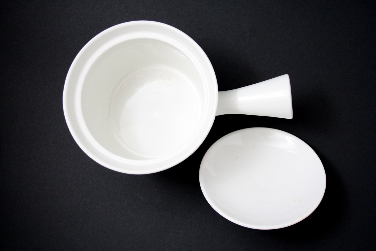 Kasserolle med låg. Højde 11 cm. Længde 18,5 cm. Diameter 12,5 cm. God stand. Pris: SOLGT