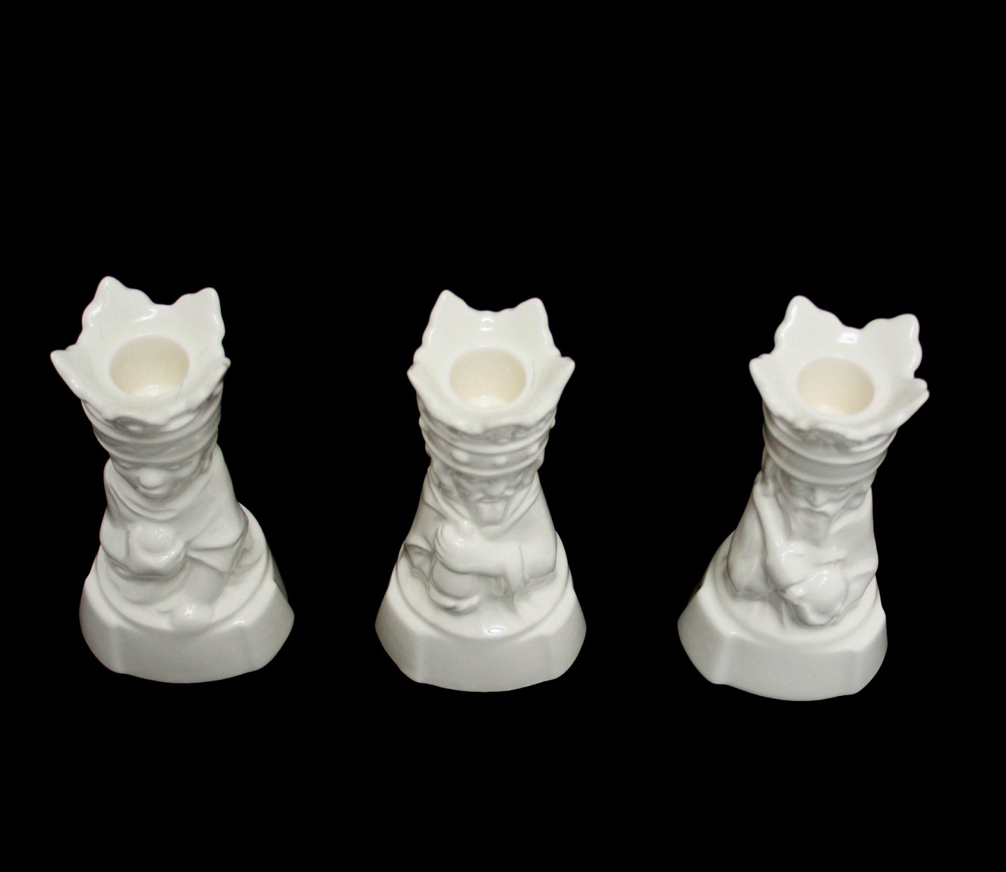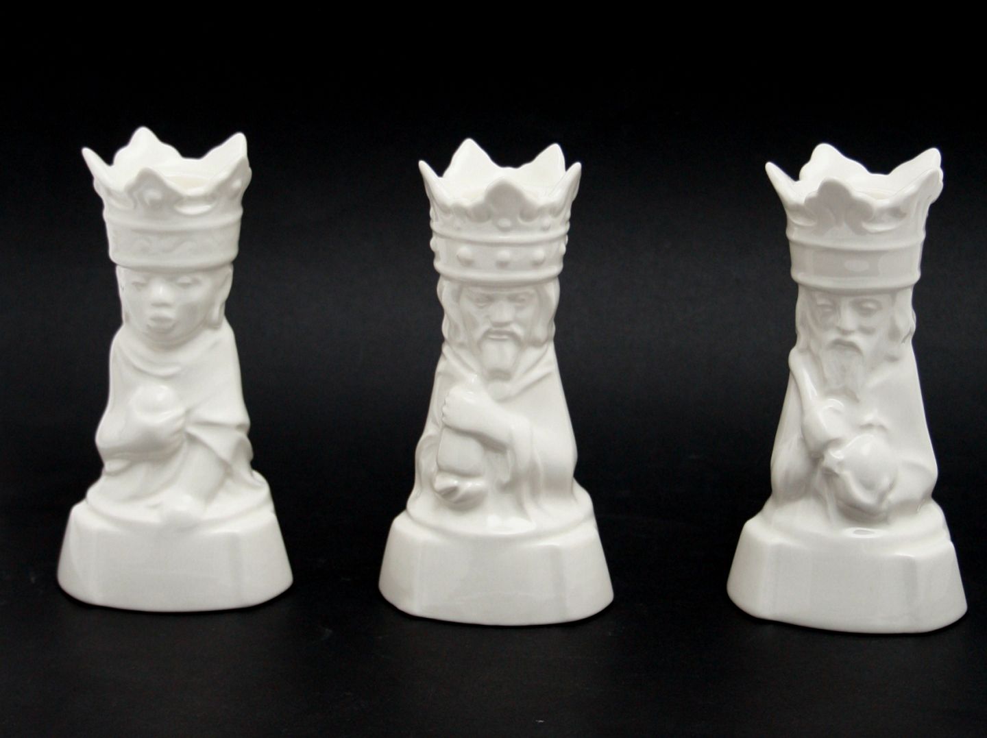 Royal Copenhagen Fajance, Lysestager Hellig tre konger, Melchior, Caspar, Balthazar. Formgivet af Rasmus Harboe. Hvidglaseret. Perfekt stand. Højde 14-14,5 cm. III. sortering. Pris: SOLGT
