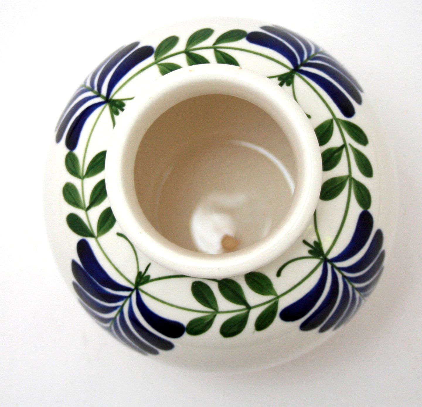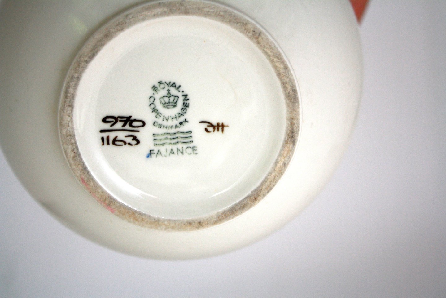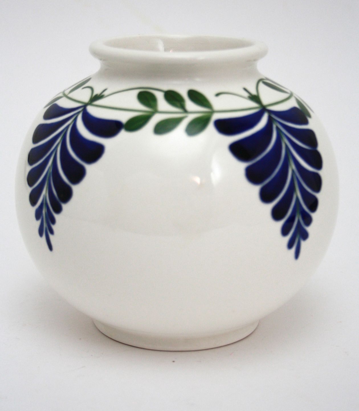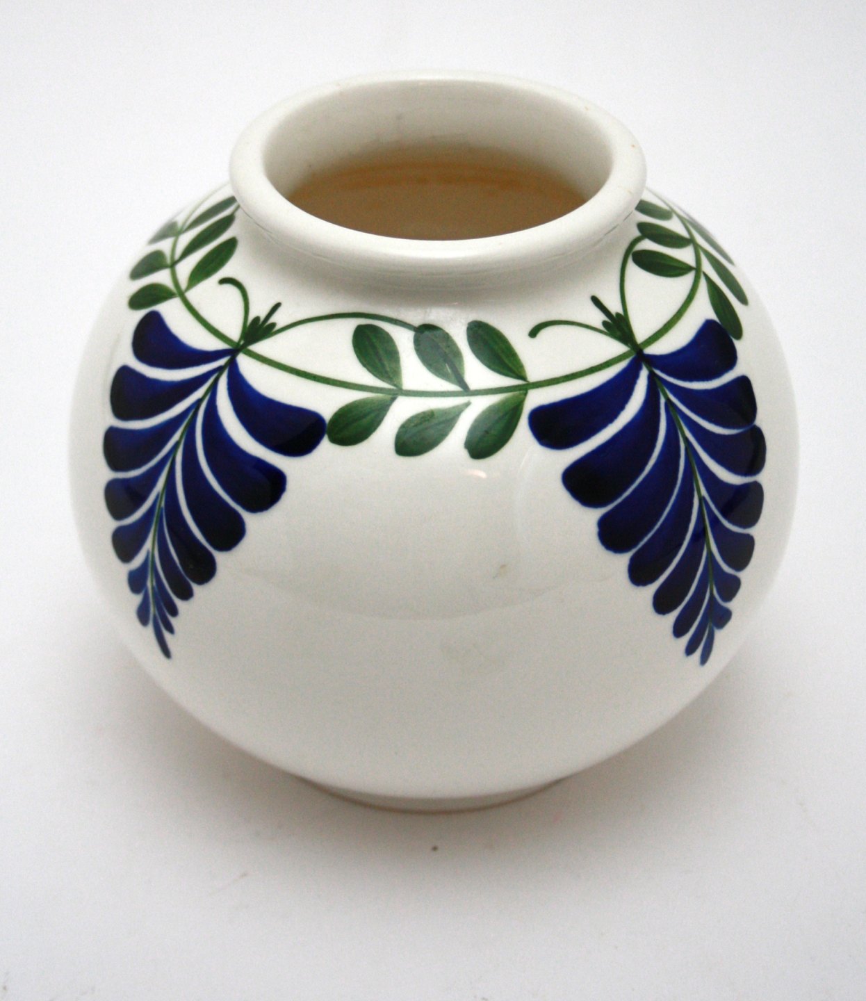 Royal Copenhagen, Blåregn, Vase. Oprindeligt designet af Christian Joachim for Aluminia. Formnr. 970/1163. Højde 11 cm. Største diameter 11 cm. III. sortering. Glausafskalning indvendig i bund. Flot stand. Pris: SOLGT