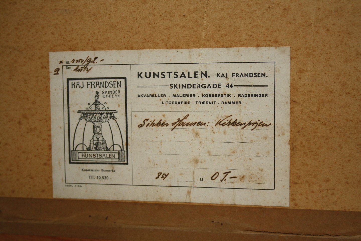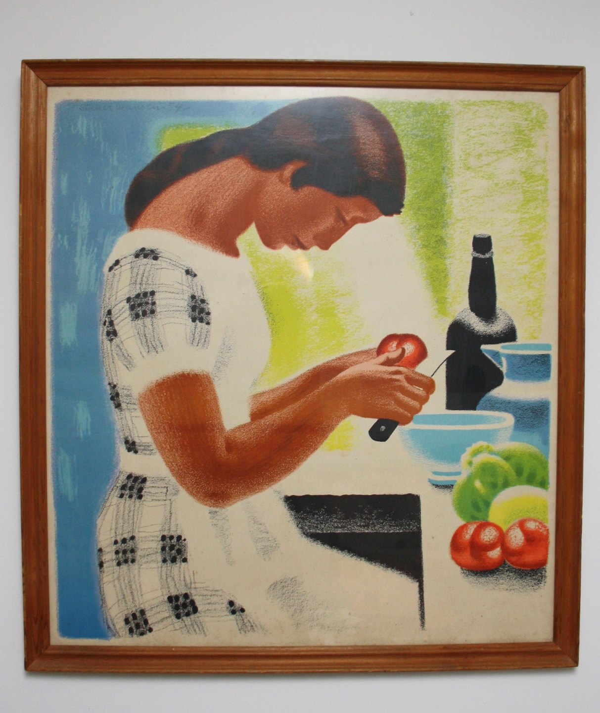 Aage Sikker Hansen, Køkkenet. Litografi. Signeret 54. Med træramme. Udvendig mål 65 x 71 cm. Billedet er solgt via Kunstsalen ved Kaj Frandsen, Skindergade i København. Motivet er senere genoptrykt som plakat, samt brugt til udstilling i Forum. Flot stand. Pris: SOLGT