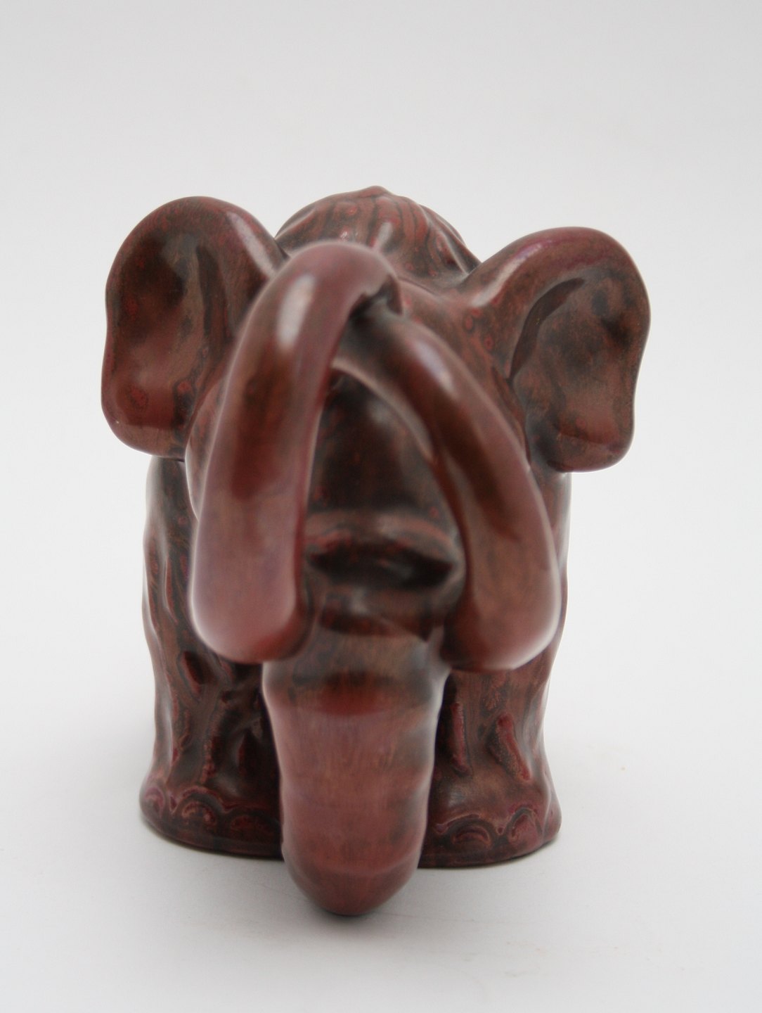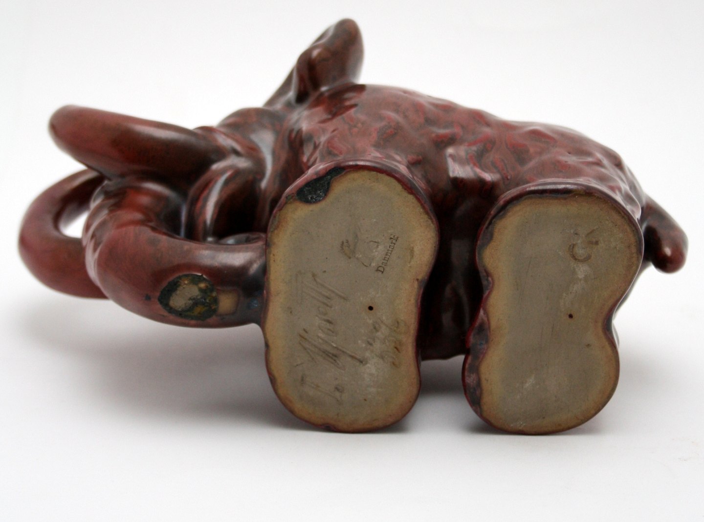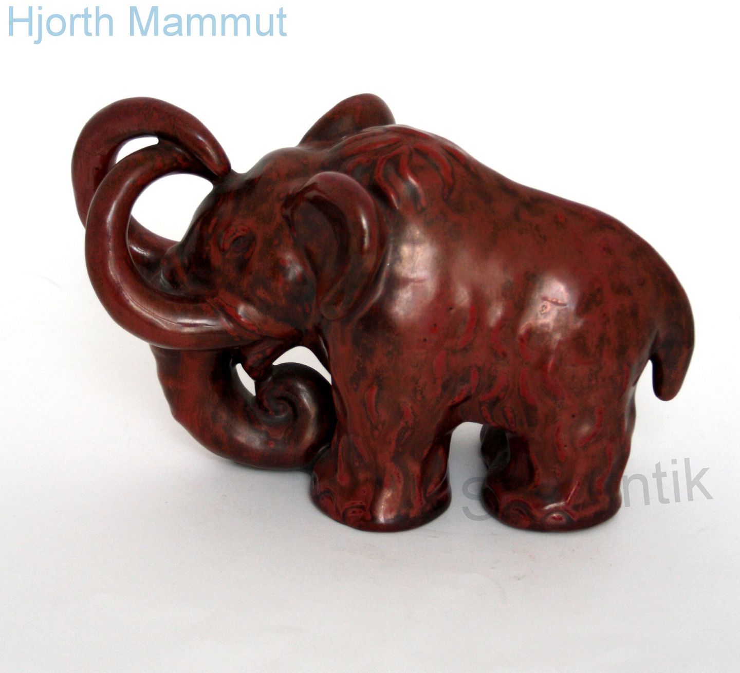 L. Hjorth, Bornholm. Mammut i okseblodsglasur. Designet af Gertrud Kudielka. Formnr. 536. Højde 13 cm. Længde 22,5 cm. Flot stand. Pris: SOLGT