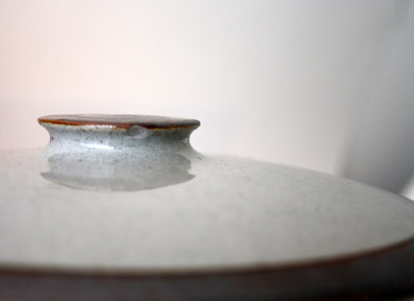 Gryde med låg. Højde 8,5 cm. Diameter 20,5 cm. Afslag på låg knop. Pris: SOLGT