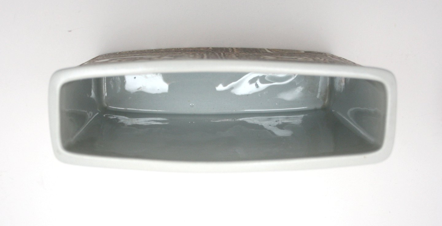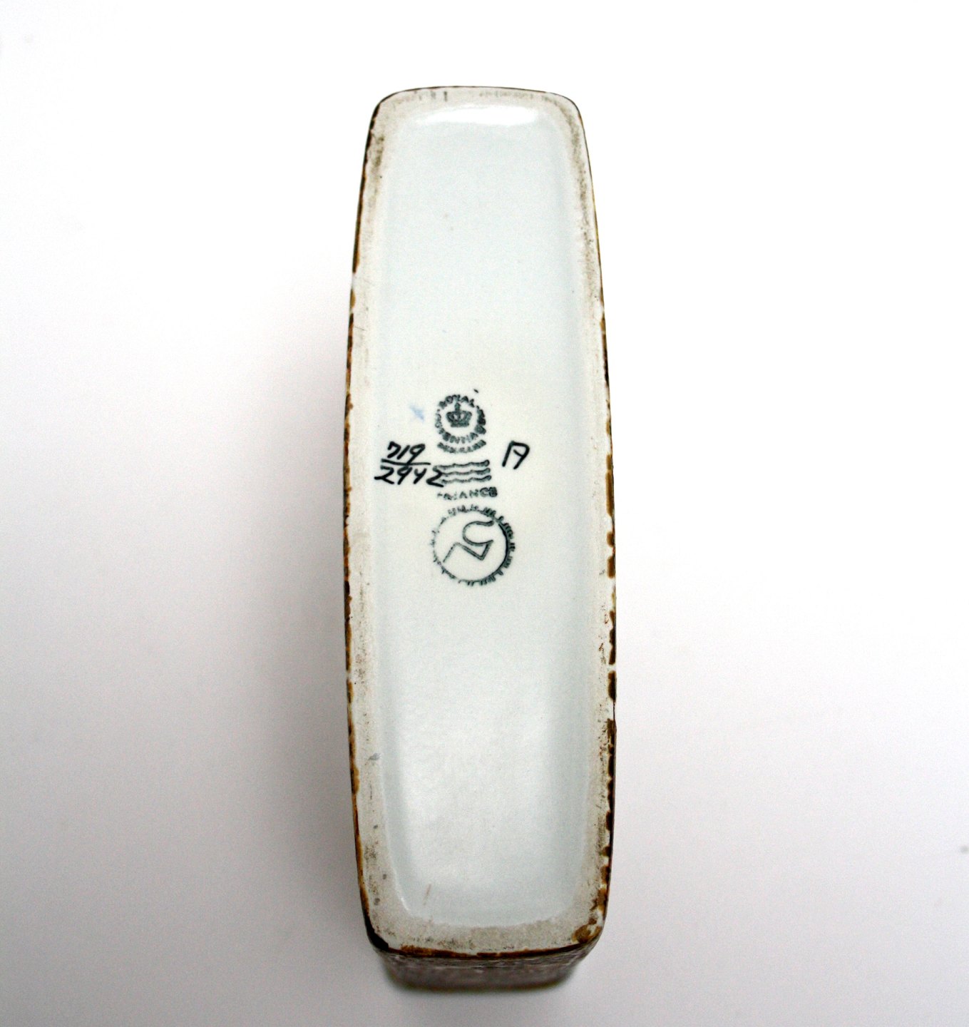Royal Copenhagen, Baca Fajance i brun og gylden glasur, smal vase designet af Nils Thorson. Nr. 719/2942. Højde 14,5 cm. Længde 18,5 cm. Bredde 6 cm. Pris: SOLGT