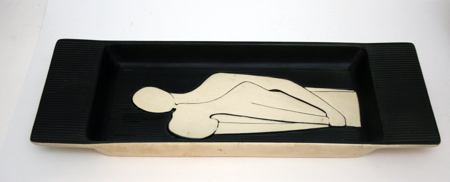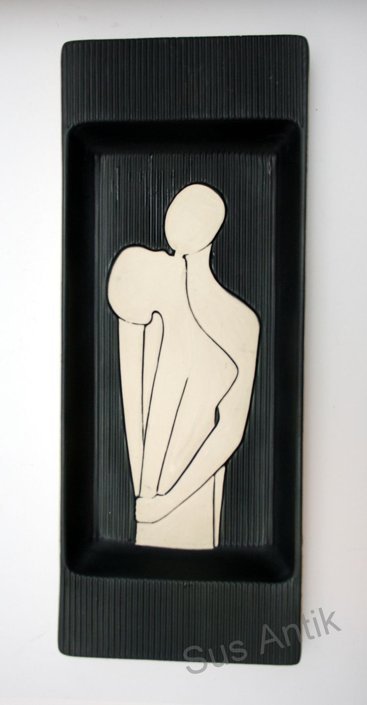 Søholm, Aflangt fad i Du og Jeg serien designet af Holm Sørensen i 1958-59. Mørkegråt rillet relief med hvidt motiv, kant og bund. Fadet kan også hænge på væggen. Formnr 508. Længde 41 cm. Bredde 16 cm. Højde 3,5 cm. Flot stand. Pris: SOLGT