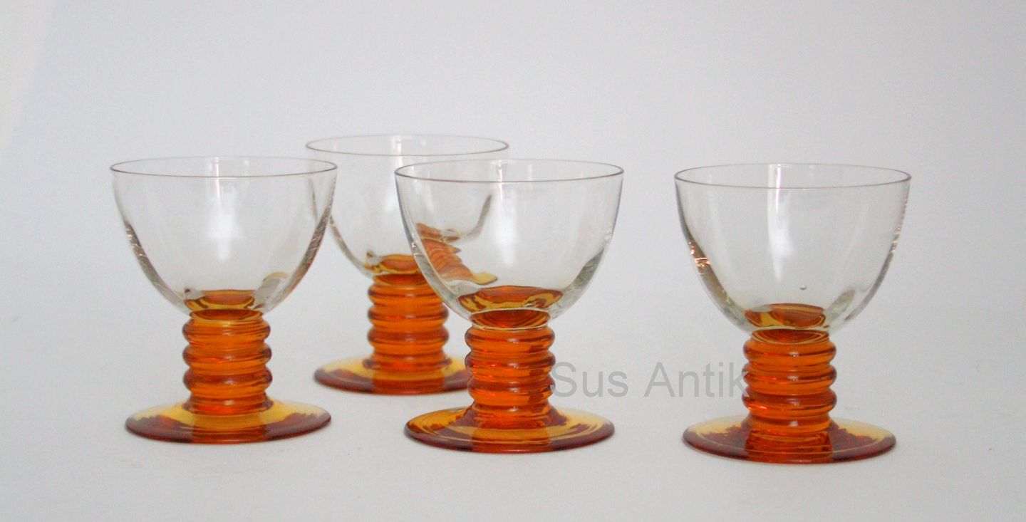 Holmegaard, Aalholm, Likørglas. Designet af Jacob E Bang. Optisk stribet kumme og ravgul fod. Højde 7,5 cm. Øverste diameter 6,5 cm. Pris: SOLGT
