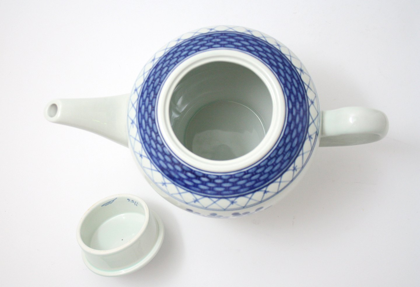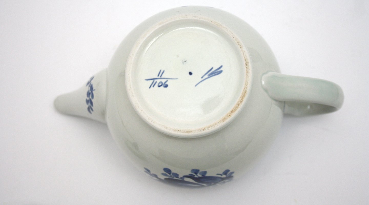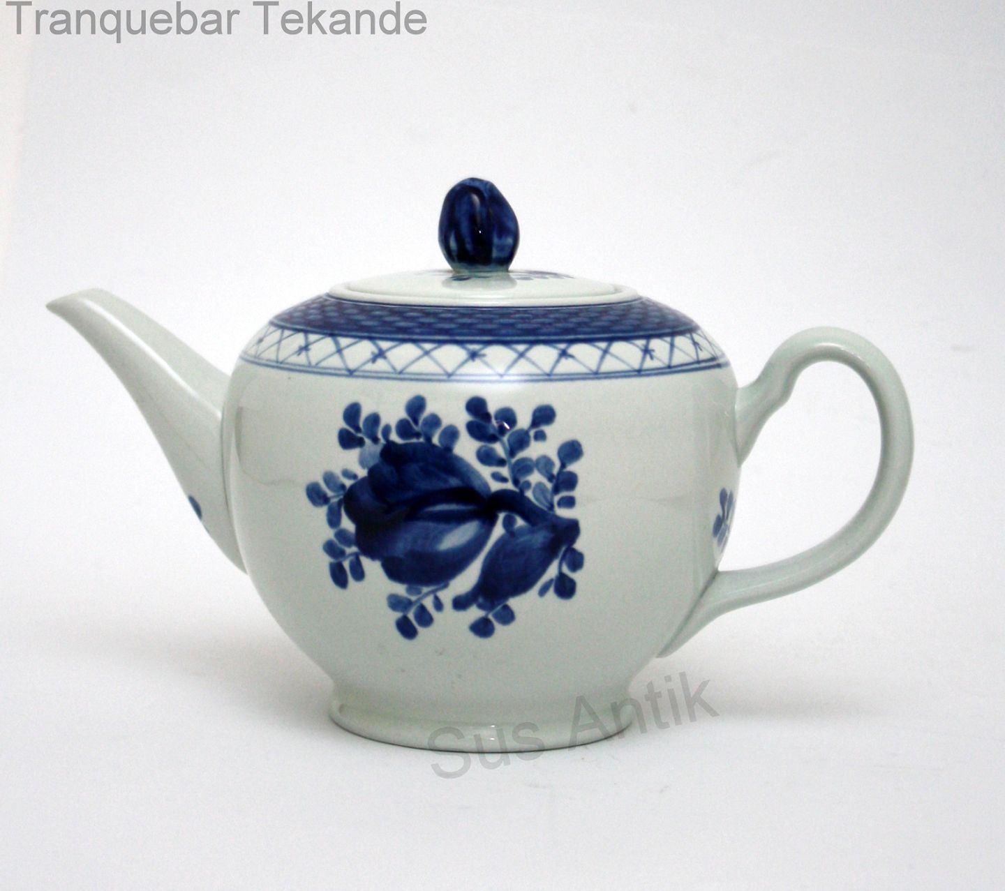 Aluminia, Tranquebar lyseblå fajance med mørkeblå tulipan og flettet bort designet af Christian Joachim. Produceret fra 1914 til 1969, hvor det overgik til Royal Copenhagen. Håndmalet.
